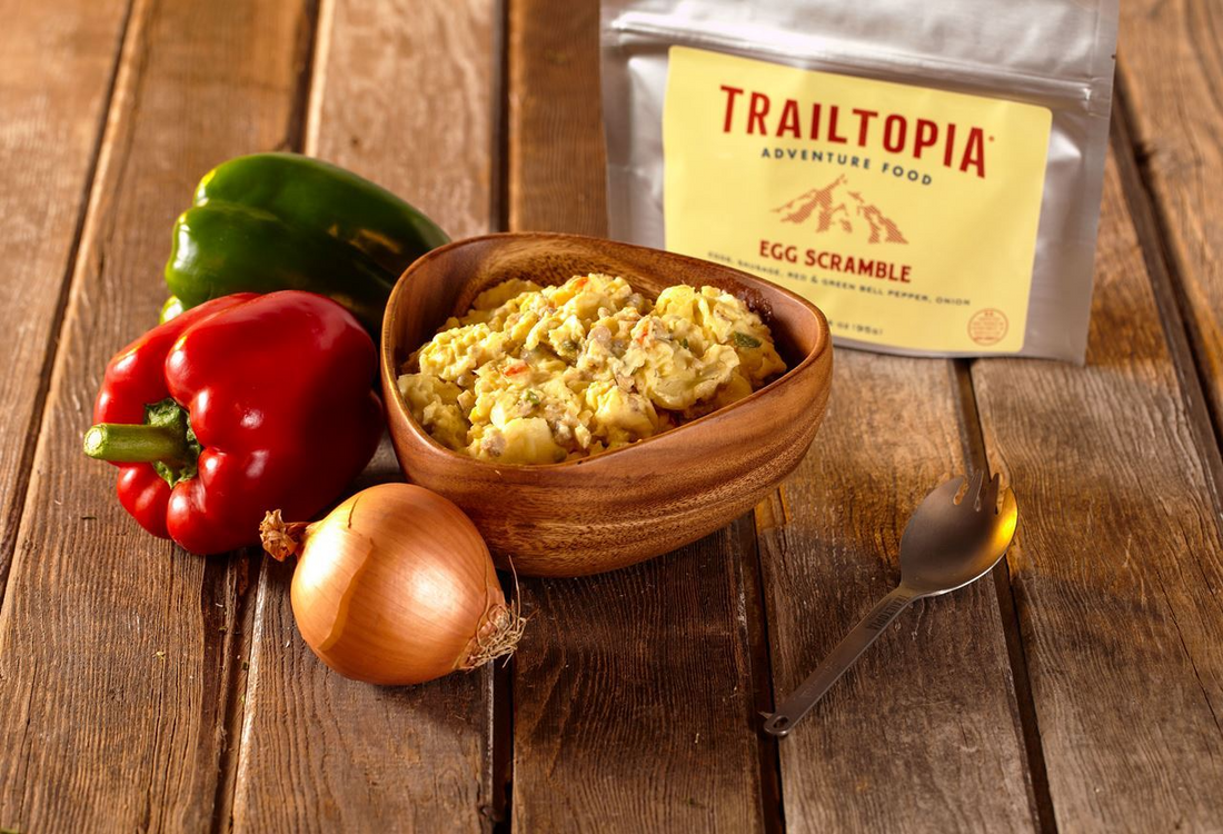 Scrambled eggs with sausage, onion, and red and green bell pepper. We’ve perfected this dish...