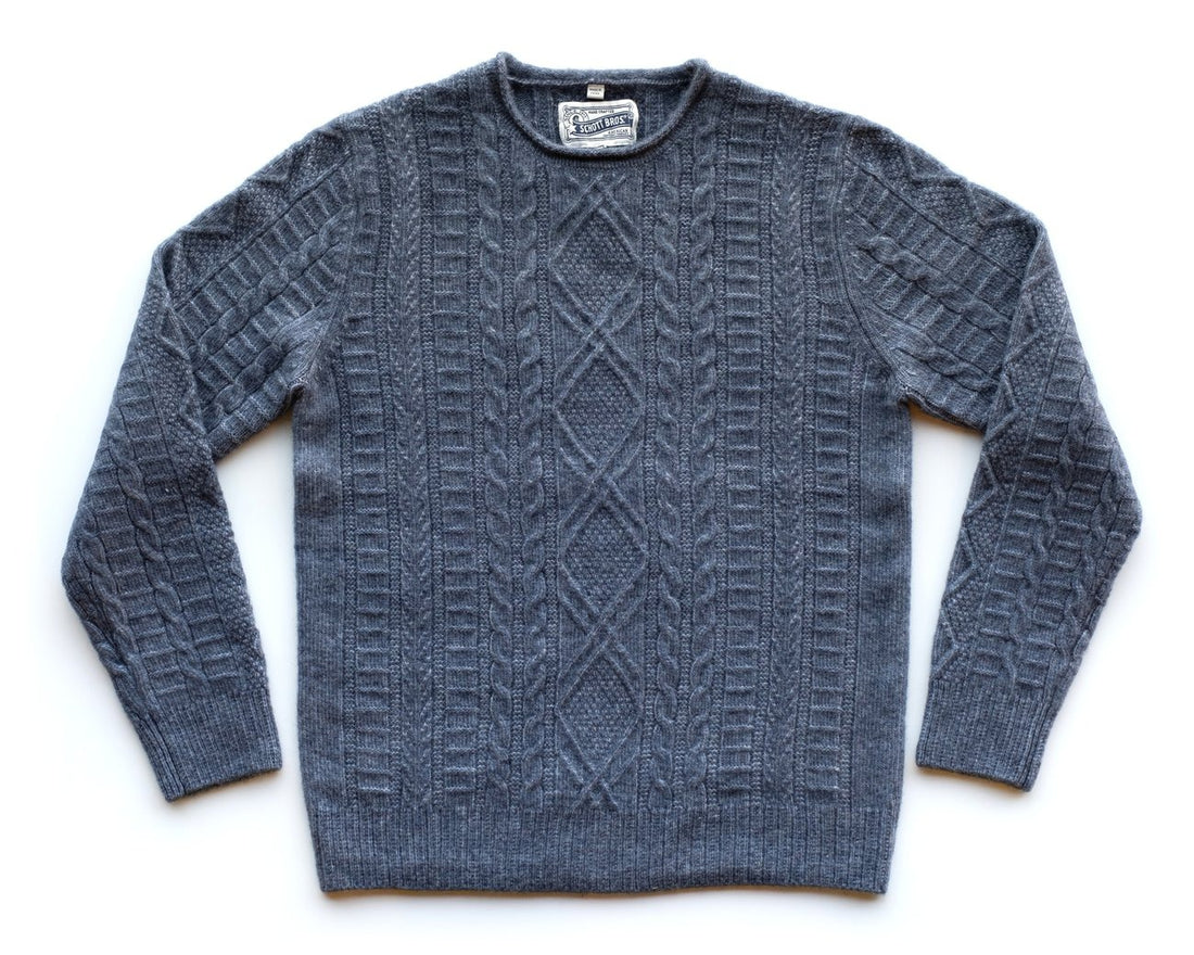 A rugged, heavyweight stonewashed cotton fisherman's sweater featuring a distinctive patchwork cable knit design for...