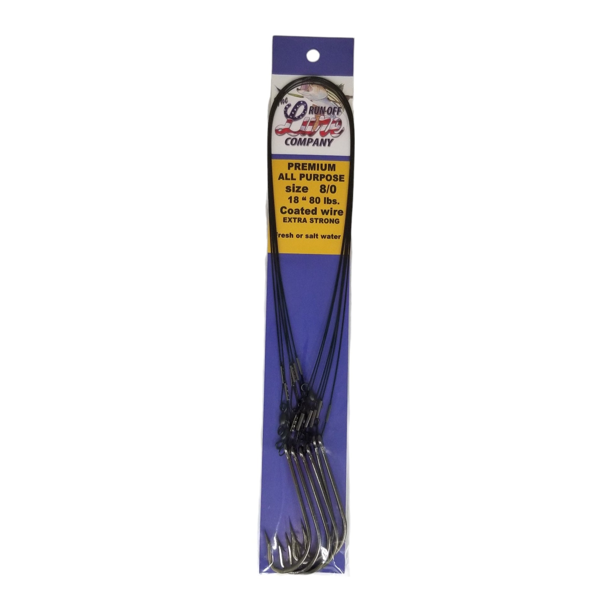 The Run Off Lures 18" Vinyl Coated 80 lb. Wire Leader features a size 8/0 hook and extra strong coated wire. These can be used in both freshwater and saltwater. This pack contains 6 wire rigs.