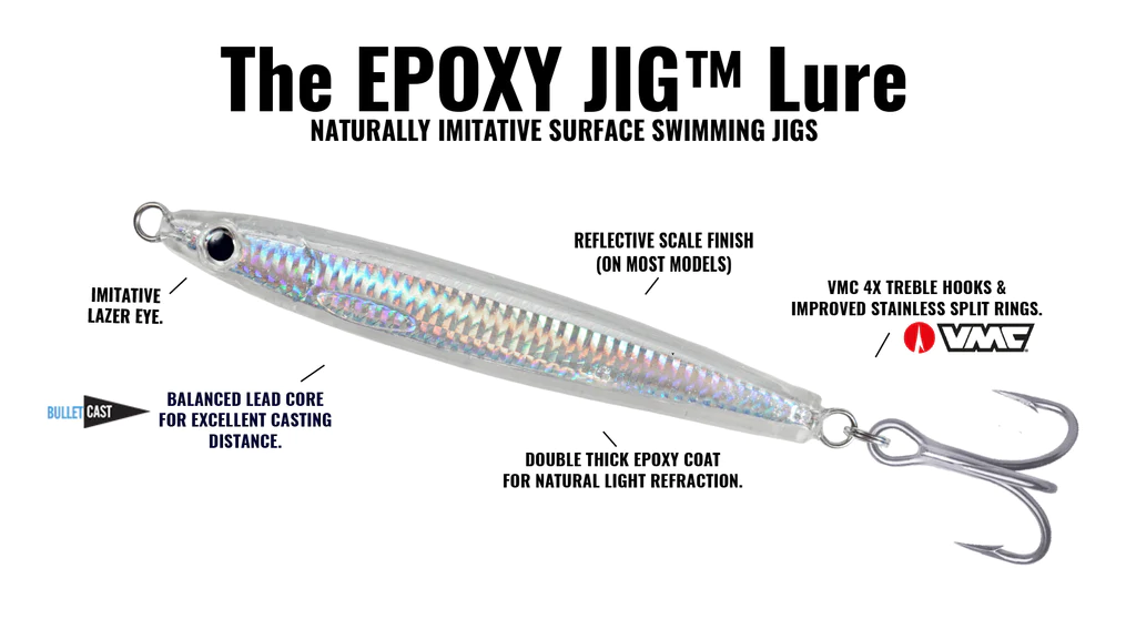 The EPOXY JIG™ Lure features a vivid scale finish core surrounded by a double thick translucent coat for excellent durability and natural refraction of light. The EPOXY JIG™ lure's light weight to length ratio produce the perfect balance of size, weight and casting distance, making them a perfect option for surface blitzes
