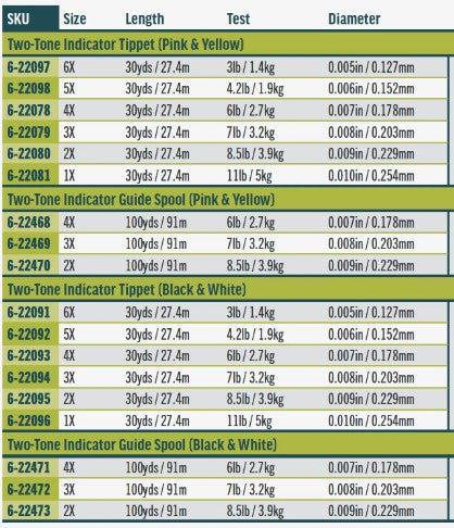Opaque two tone 8" sections of fluorescent pink and fluorescent chartreuse, or black and white color changing tippet with highly defined hard color changes. These color breaks create maximum contrast to allow anglers to get visual cues when tight line nymphing. The best indicator material for building sighters for European Style Nymphing. Both colors are available in regular 30 yard spools, or in bulk guide spools of 100 yards, which saves packaging waste, and money for anglers who use a lot.A hi-vis, two colored nylon tippet, with color changes every 8" - ideal for nymphing and indicators