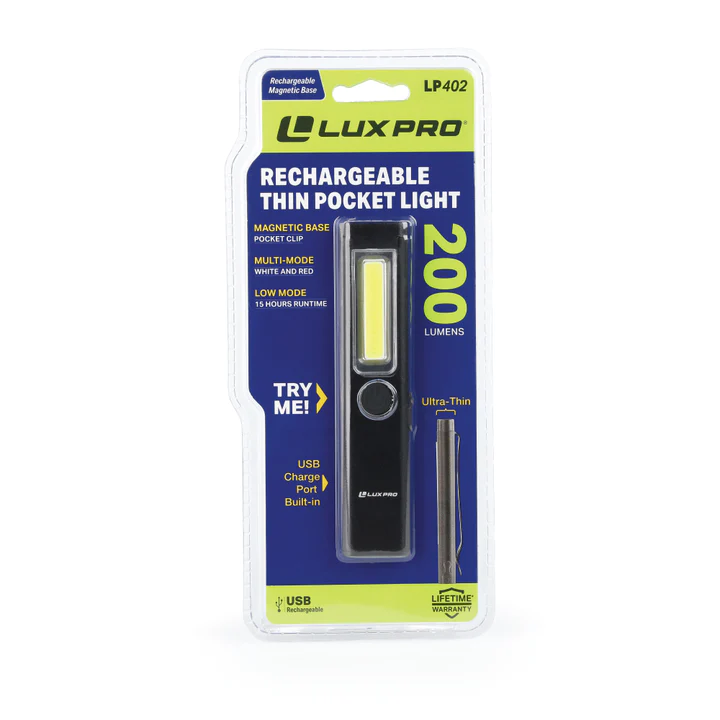 The LP402 ultra-thin pocket light is optimal for everyday carry. This pocket light fits easily in your pocket, bag, or glove box. The sturdy pocket clip makes for easy portability and the metal base allows for convenient placement on metal surfaces. Use hands-free; the clip features a hole for hanging, providing light where you need it. This compact light is not only ultra-thin but also ultra-bright, with 200 lumens of light that reaches up to 20 meters on high mode. The LP402 Boasts an impressive runtime of 15 hours on low and conveniently charges in just 2 hours with the included micro-USB charging cable. This multifunctional light has 5 modes: High, Med, Low, Red, and Hidden Strobe, featuring the latest LED technology. The LP402 has an advanced variable brightness switch that allows you to cycle through modes by pressing the on/off button or holding the button for 3 seconds to access the hidden strobe mode. This light comes backed by a Limited Warranty Against Manufacturer's Defects. Constructed with durable, high-quality aluminum and IPX54 waterproof rated, this is the light you want in your pocket.