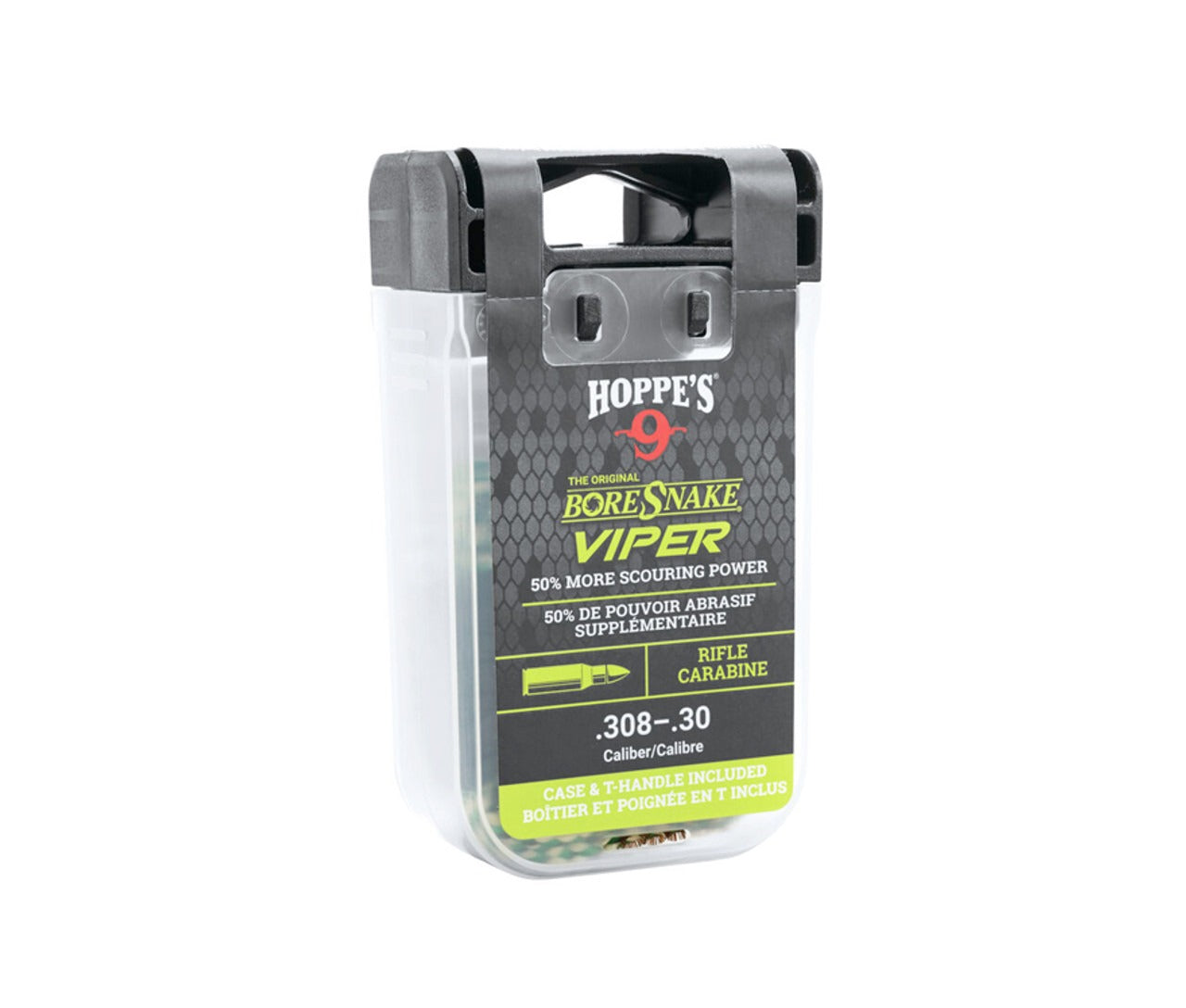 The .308-.30 Boresnake Viper with Den Rifle has a new and improved home that now includes a T-handle for easier pull through and a reusable carrying case that you can keep in your range bag or backpack to protect your BoreSnake. A one pass solution, BoreSnake uses an integrated bronze brush to scrub out carbon fouling, while the tail clears the barrel of loose debris with a surface area 160x larger than a standard patch.