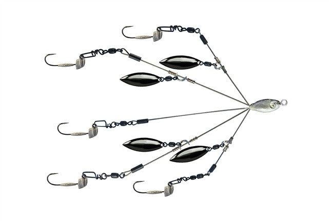 The Picasso Lures 4" Micro Bait Ball Umbrella Rig includes 1/16 oz. jig heads with 1/0 hooks. Constructed with a lightweight .024" heat-treated wire, this rig was designed as a small profile rig for bass. Casting this rig is easy with a medium heavy rod and is recommended to be used with 10 - 12 lb. fluorocarbon line. This size is great for targeting suspended fish that are feeding on smaller baitfish or it can be worked down a bank in place of spinnerbait. It features a high-impact resistant plastic head to withstand strikes and an embedded nose swivel prevents line twists. The small willow blades provide a flickering flash to attract fish and reduce lift.