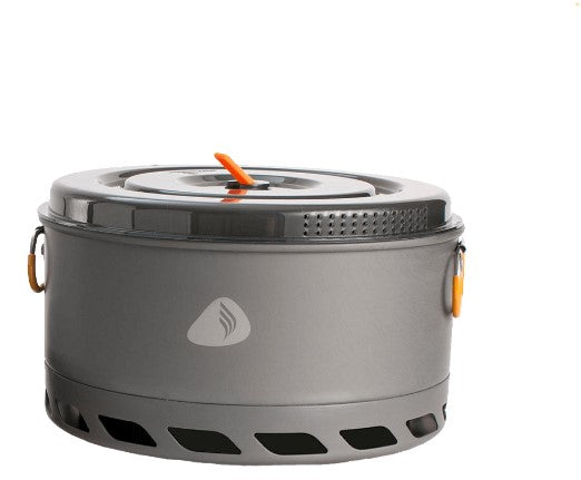 Quickly and efficiently boil water or simmer up some chili for larger groups with the 5-liter FluxRing pot. Jetboil's FluxRing technology features a hard-anodized aluminum construction that delivers extremely efficient boiling times despite the large capacity. Use the 5-liter pot to cook larger basecamp meals, such as rice dishes, pastas, or even a pot roast. Easily move the pot from the cook stove to the table without burning your hands with the insulated handles. The FluxRing pot is optimized for use with the Jetboil Genesis and HalfGen cook stoves, which nest snugly within the pot. Includes strainer lid and protective skirt; measures 10 inches in diameter by 6 inches tall; weighs 32.9 ounces.