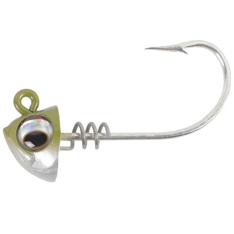 While jig heads are often overlooked in their design and implementation, the No Live Bait Needed (NLBN) Screwlock Jig Heads - 5" Bait were designed to be one of the best on the market. Starting off, each jig head utilizes a short shank 8/0 2X Mustad hook, providing great strength for the hardest fighting fish such as tarpon, striped bass, snook, redfish and more, while also delivering great wear resistance when hitting structure such as rocks, clam beds, and other debris. An oversized stainless-steel screw lock makes securing your soft bait easy, without the need of superglue and truly locks down your bait when getting roughed up by striking fish or strong casts. The head design itself is perfectly balanced to reduce the baits body roll, while oversized 3D eyes deliver great realism and flash. For the angler looking for a performance option to tackle some of the meanest predators we have, these NLBN jig heads deliver to give their paddle tails an uncompromised option with the best components available.