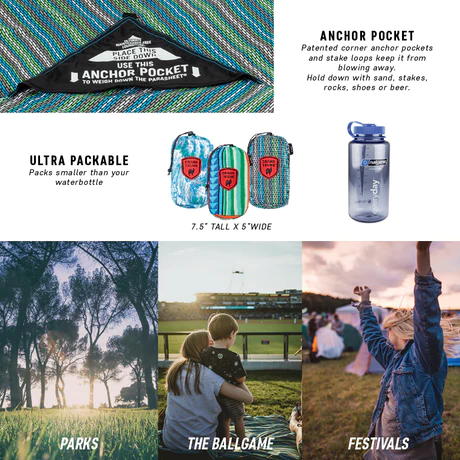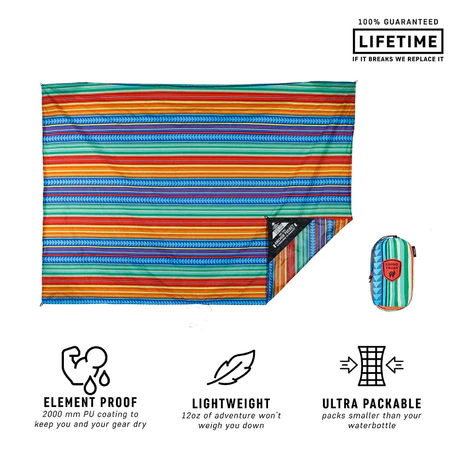 The perfectly designed, patented, waterproof adventure sheet. An essential item for lounging at a music festival, campground or beach. Featuring a PU coating to keep your rear and gear dry. The patented anchor pocket design helps fight winds, keeping your sheet in-place, while the added stake loops are great for use on firm ground. Made for transport to destinations near and far, this compact blanket quickly folds and unfolds for on-the-go convenience with an attached stuff sack for storage.