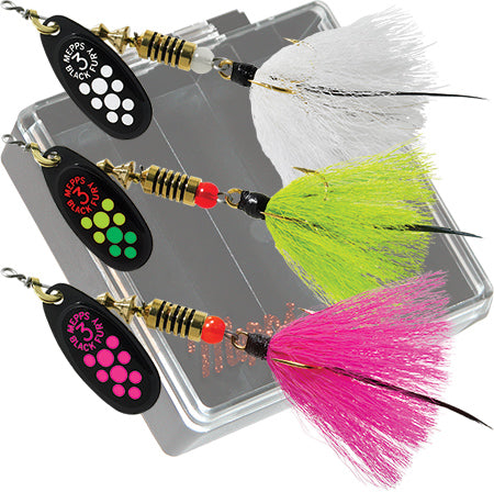 The Mepps Black Fury Bass Pocket Pac helps the bass fisherman select the right lure for either largemouth or smallmouth bass. It features three #3 (1/4 oz.) Black Fury spinners. The dots on the blades of the Black Fury provide contrast under a wide variety of fishing conditions. A bright lathe-turned bead and gold plated treble hook add to this contrast making the Black Fury extremely effective under almost all water and weather conditions. Black Furies can be fished just as effectively day or night. A slightly elongated blade means the Black Fury runs just a little deeper than the classic Mepps Aglia. Like the Aglia, you can control the depth during the retrieve simple by raising or lowering your rod-tip. Perfect for stream or lake.