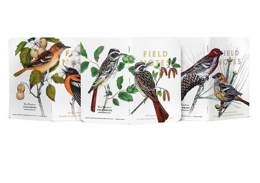 Field Notes has carefully reproduced nine of Brasher's colorful illustrations for three 3-Packs of Field Notes Ruled Memo Books. Covers are a lovely felt-textured100#C Mohawk Via “Pure White,” bound by three stainless steel staples. The bodies are 60#T Domtar Lynx Opaque Ultra, ruled with pale gray lines.