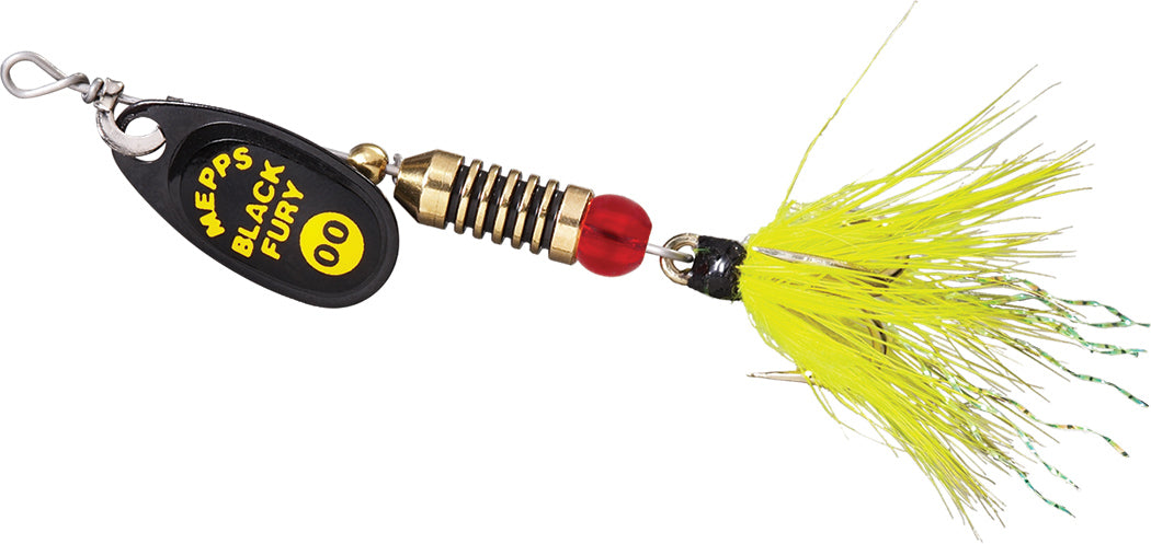 The dressed Black Fury is one of the great all-time Mepps spinners for catching everything from trophy largemouth bass, smallmouth bass, northern pike and musky, to panfish and small stream trout. The special Black Fury blade spins closer to the body than the classic Aglia blade so it easily fishes shallow to mid-depths. All Mepps Black Furys are excellent low light (early morning, evening or overcast) spinners as well as a perfect choice for sunny days when contrast with the brightness of the water, weeds and structure is needed. All dressed Black Furys feature either natural squirrel tail or bucktail.