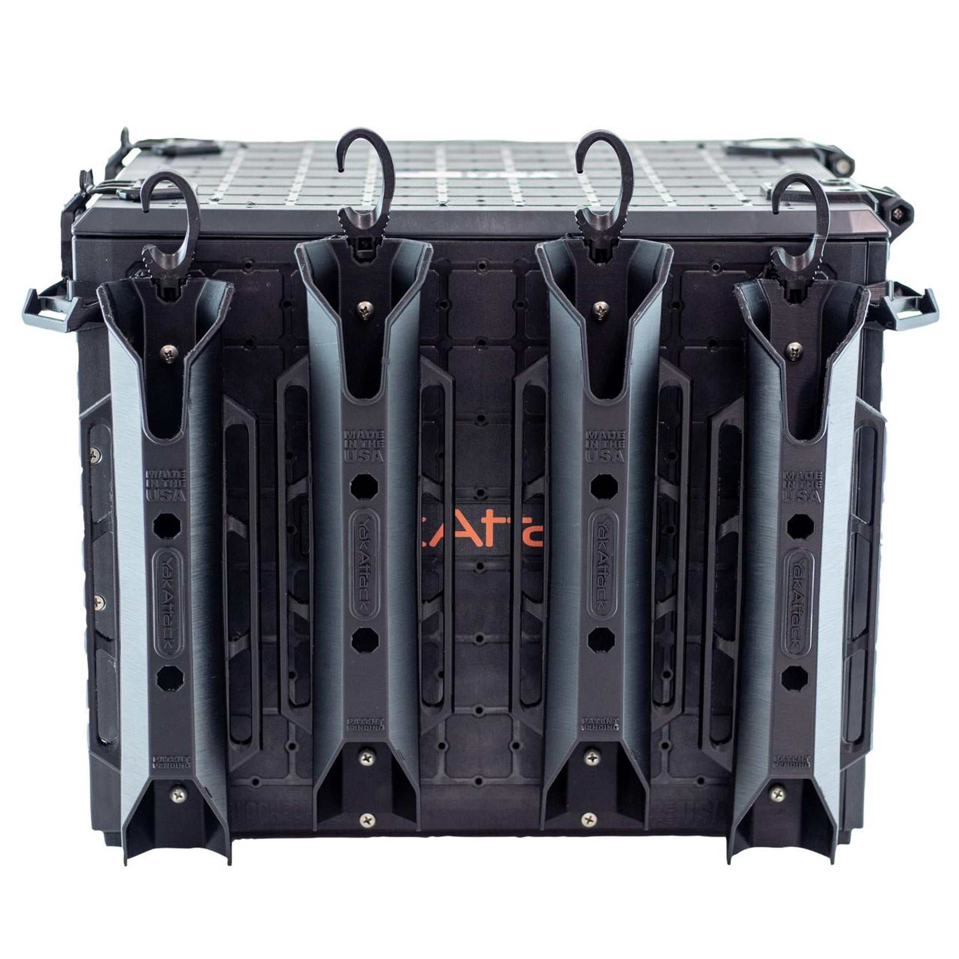 Rubber feet offer noise dampening and isolation, while Omni corner brackets enable multiple hold-down methods. They are designed as attachment points for YakAttack OmniHooks (four of which are included), generic hooks, carabiners, or simple bungee.
