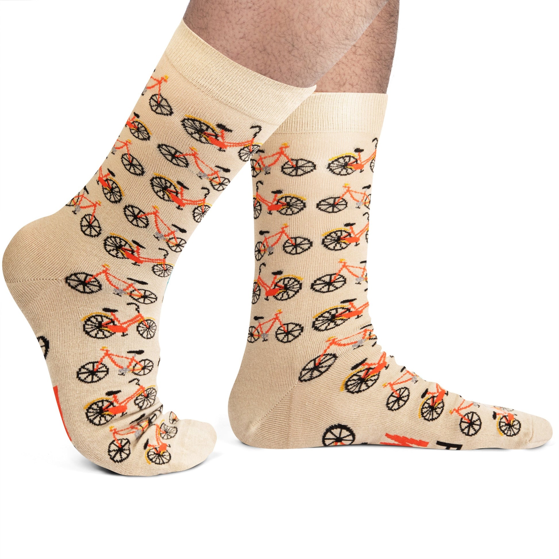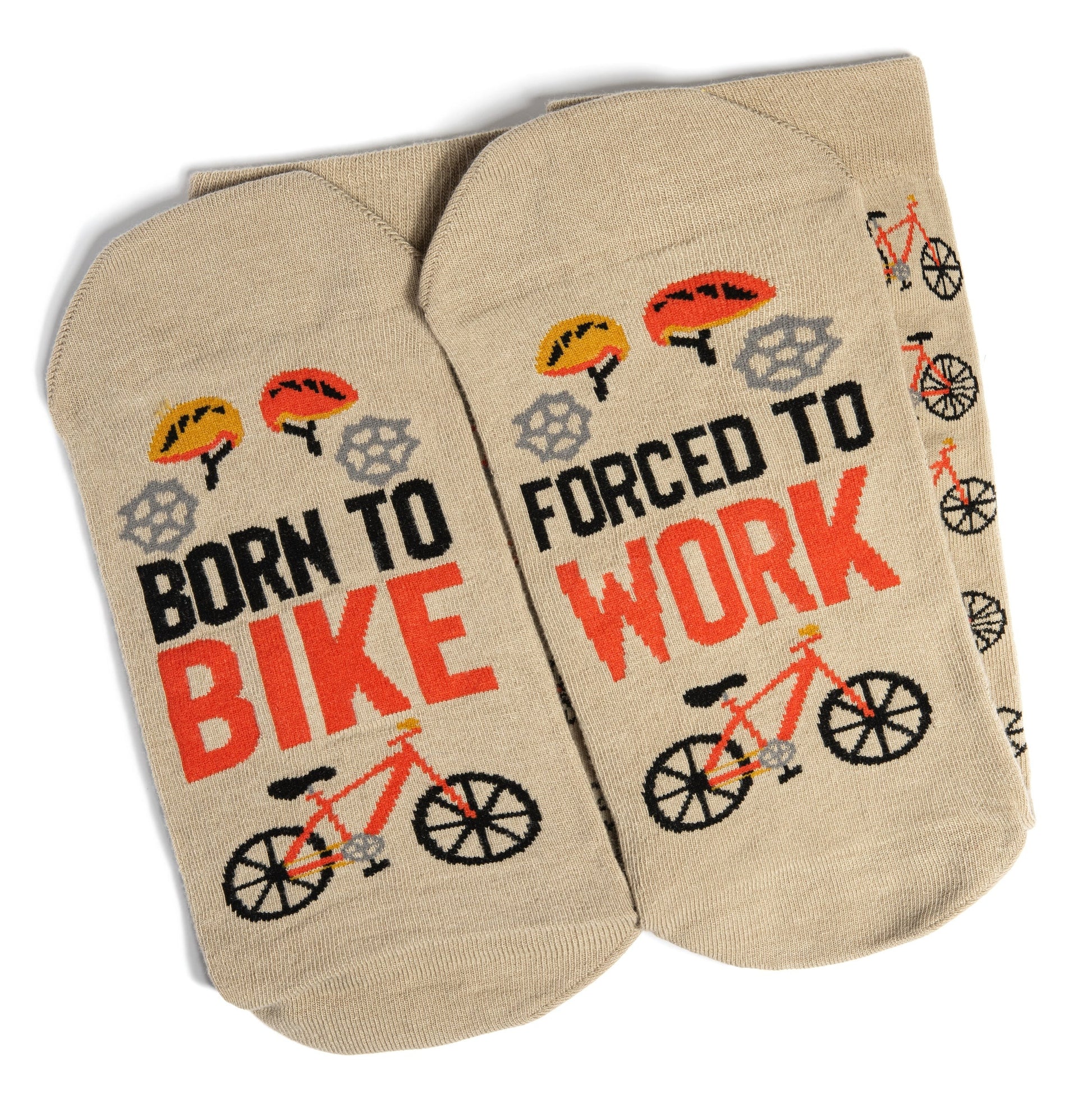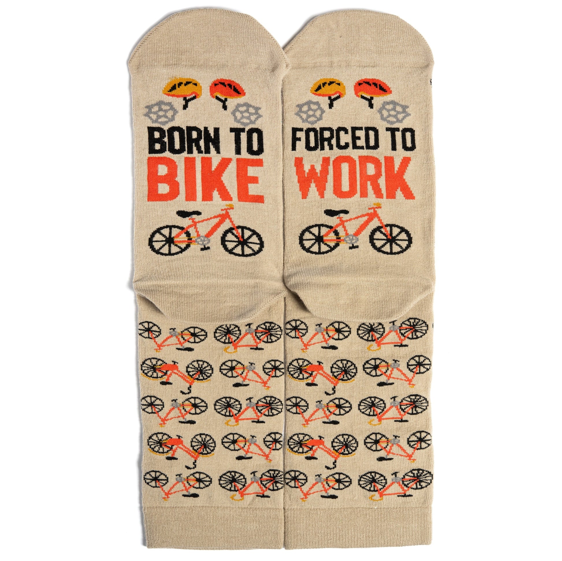 Introducing our dapper crew socks designed for cyclists - the perfect blend of style for both work and biking. These socks feature original, unique art with a cool bicycle pattern, and a hidden message that's sure to bring a smile to any bike lover: "Born to Bike, Forced to Work."
