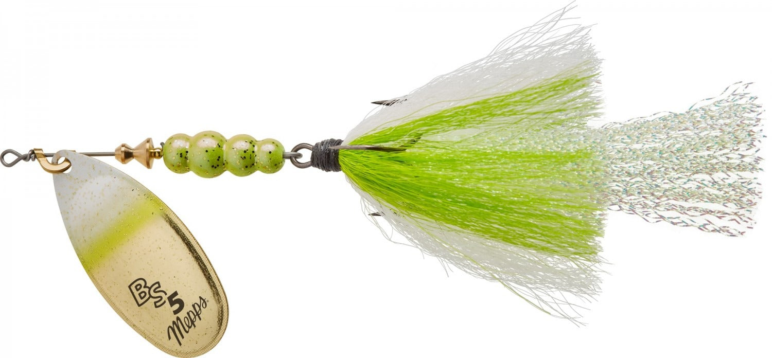 The Mepps #5 Bronze Slammer Spinner is a tournament grade spinner designed with an emphasis on catching big smallmouth bass on large bodies of water. The hand painted blades and bodies with glitter mimic various bait fish patterns that bass feed on. They also add contrast to the blinding underwater flash of the silver, gold, and black nickel blades. The solid brass clevis is what allows the blade on this spinner to start spinning as soon as the lure hits the water. Featuring a perfect balance of premium hand-tied bucktail and flashabou, the flashabou is designed to be more pronounced in the middle to create extra tail action and more flash when swimming through the water. The dressed treble hook is designed to offer an extra large profile that is over 20% larger than the standard Dressed Aglia profile. This VMC Barbarian Treble Hook features a technical locking curve to offer a 25% improved hook up rate, which decreases the chance of losing out on a big fish.