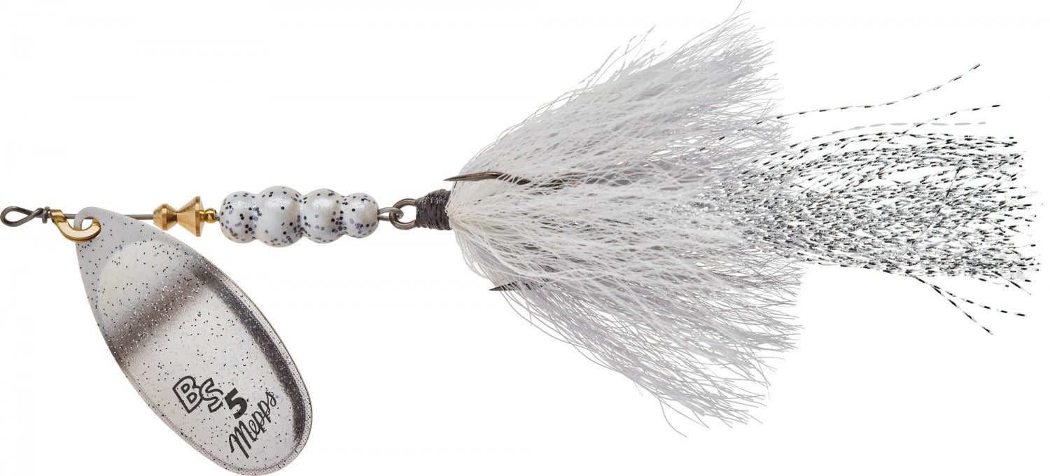 The Mepps #5 Bronze Slammer Spinner is a tournament grade spinner designed with an emphasis on catching big smallmouth bass on large bodies of water. The hand painted blades and bodies with glitter mimic various bait fish patterns that bass feed on. They also add contrast to the blinding underwater flash of the silver, gold, and black nickel blades. The solid brass clevis is what allows the blade on this spinner to start spinning as soon as the lure hits the water. Featuring a perfect balance of premium hand-tied bucktail and flashabou, the flashabou is designed to be more pronounced in the middle to create extra tail action and more flash when swimming through the water. The dressed treble hook is designed to offer an extra large profile that is over 20% larger than the standard Dressed Aglia profile. This VMC Barbarian Treble Hook features a technical locking curve to offer a 25% improved hook up rate, which decreases the chance of losing out on a big fish.