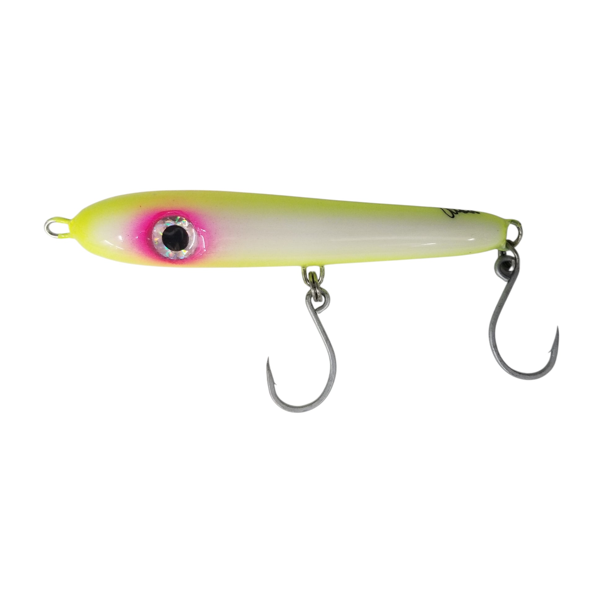 The Alan's Custom Lures 1.5 oz. Bully Spook Bait features a full resin construction and can be worked slow or quick across the surface of the water, gliding side to side. Surfcasters and boat fishermen can target fish feeding on the surface with this plug or right below the surface, with the rod kept very low. It's important to work in some pauses on the retrieve to mimic a wounded baitfish.