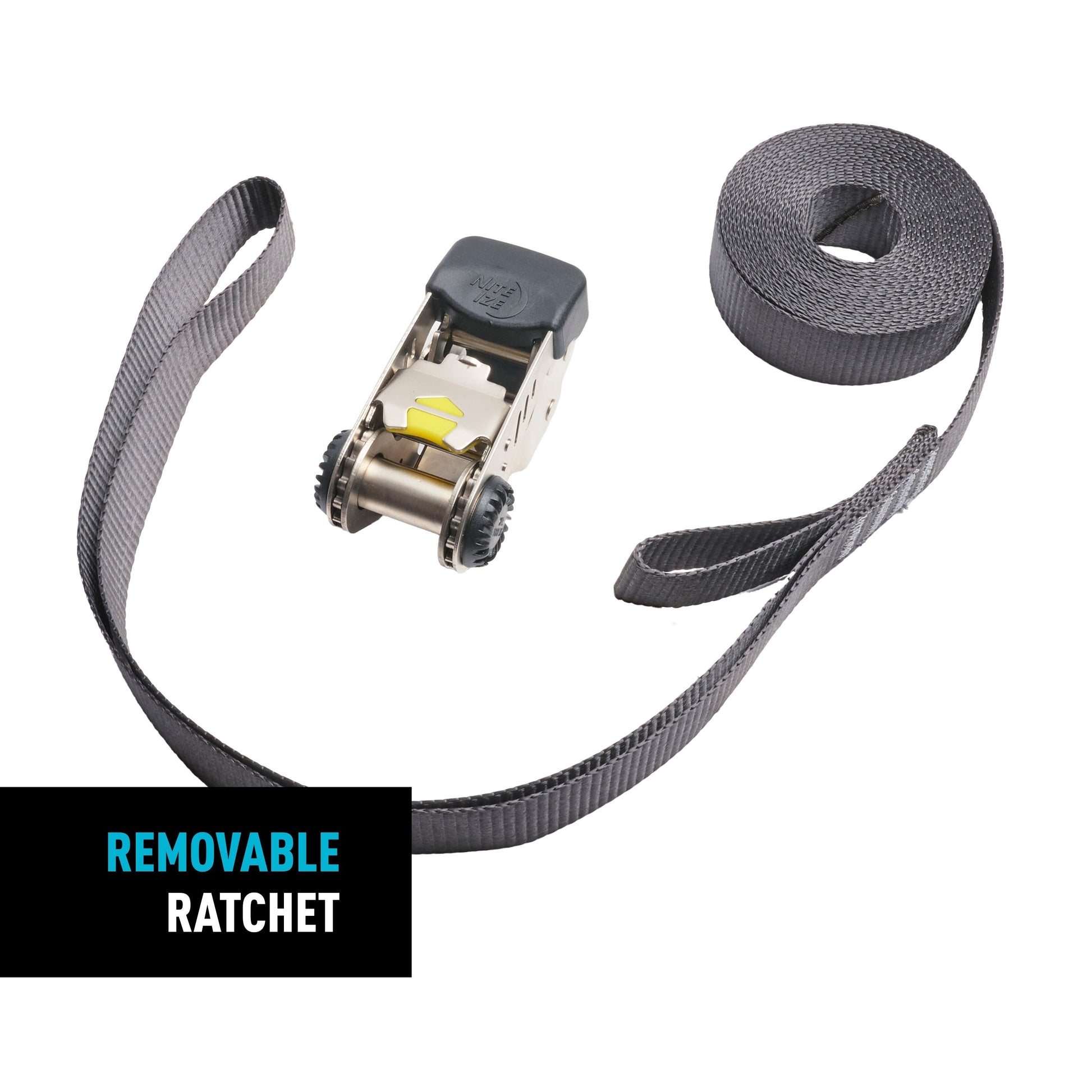 - Includes : 2 CamJam Ratchets, 2 HookLock Strap Hooks, 2 Double-Loop 15’ (4.6m) Webbing Straps, and 2 Storage Bags