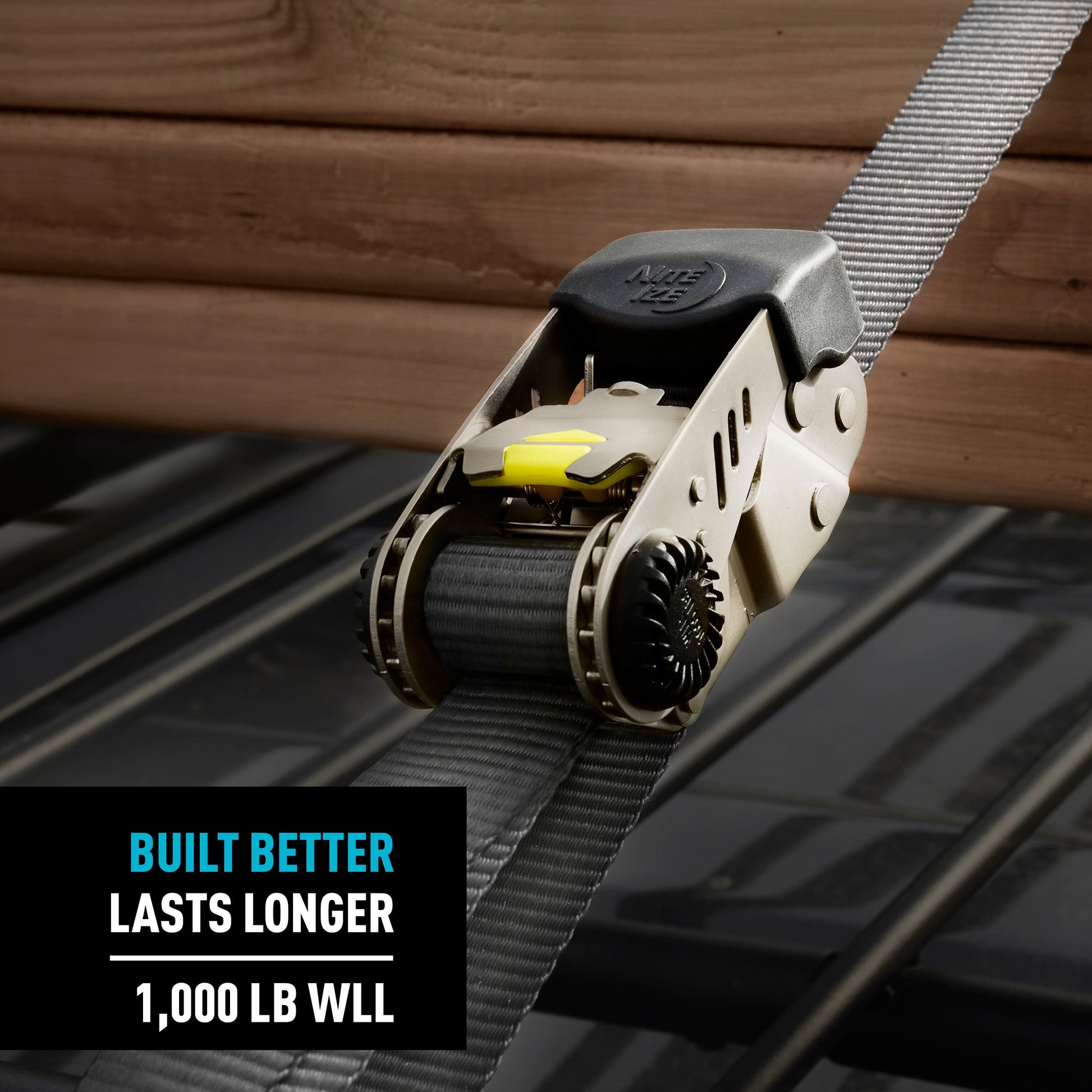The expertly engineered CamJam Ratchet Strap System reinvents the ratchet strap with the user in mind. The system is built better and lasts longer, coming fully stocked with two super tough steel ratchets and two single-loop 15-foot polyester webbing straps. Offering the first-ever removable, adjustable ratchet, the system allows you to simply position the ratchet anywhere on the strap for ultimate device accessibility and flexibility when securing heavy loads, with a working load limit of 1,000 lbs. The stitched-in loop on the 1” strap enables you to securely attach the strap to an anchor point with a soft connection using a versatile girth hitch, which won’t slip off like an open S-hook. When it’s time to induce tension, the innovative spool design allows you to easily rotate and feed the strap end into the ratchet. The built-in Tension Boost Technology™ reduces ratcheting effort by half while nearly doubling the induced strap tension, ensuring smooth operation and long-lasting performance. You can travel in confidence knowing your load is secure.
