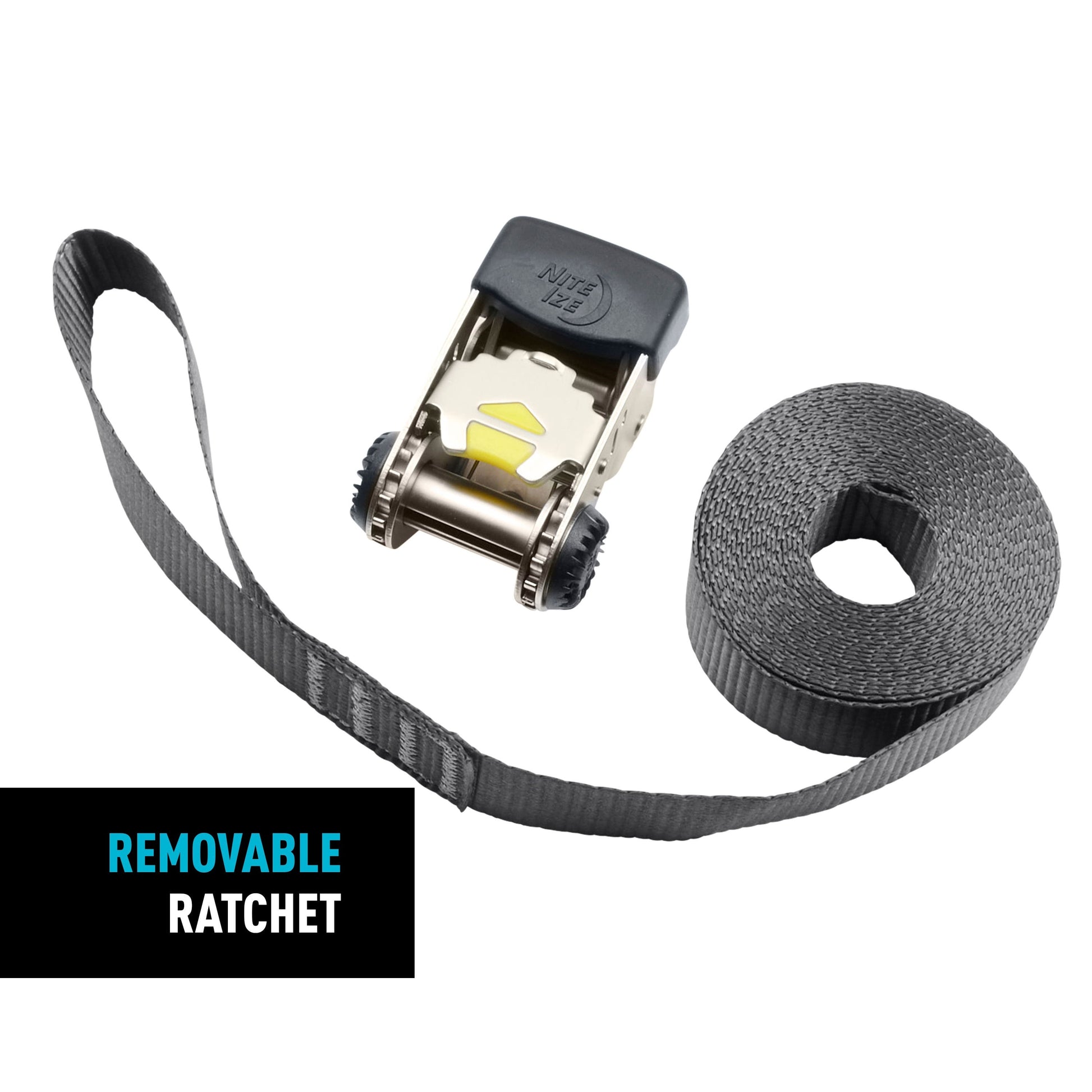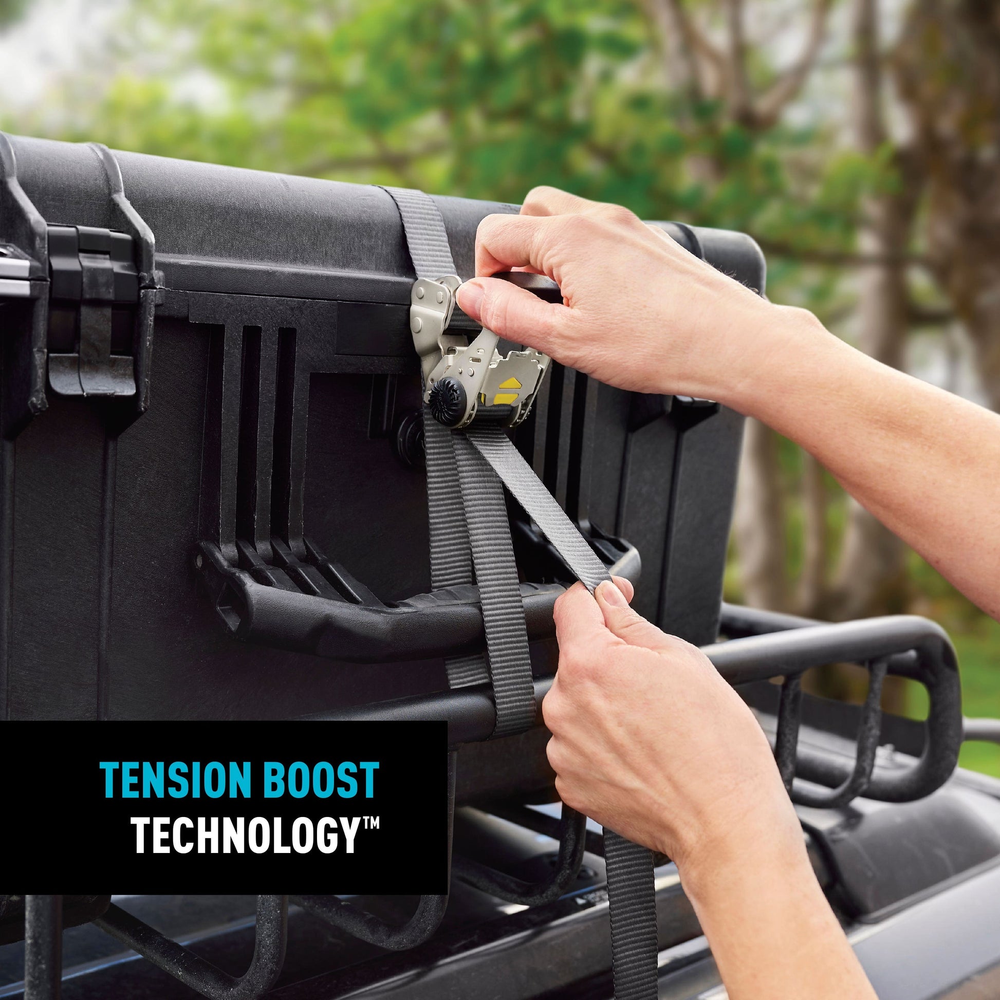 The expertly engineered CamJam Ratchet Strap System reinvents the ratchet strap with the user in mind. The system is built better and lasts longer, coming fully stocked with a super tough steel ratchet and a single-loop 12-foot polyester webbing strap. Offering the first-ever removable, adjustable ratchet, the system allows you to simply position the ratchet anywhere on the strap for ultimate device accessibility and flexibility when securing medium loads, with a working limit up to 500 lbs. The stitched-in loop on the 1” strap enables you to securely attach the strap to an anchor point with a soft connection using a versatile girth hitch, which won’t slip off like an open S-hook. When it’s time to induce tension, the innovative spool design allows you to easily rotate and feed the strap end into the ratchet. The built-in Tension Boost Technology™ reduces ratcheting effort by half while nearly doubling the induced strap tension, ensuring smooth operation and long-lasting performance. You can travel in confidence knowing your load is secure.