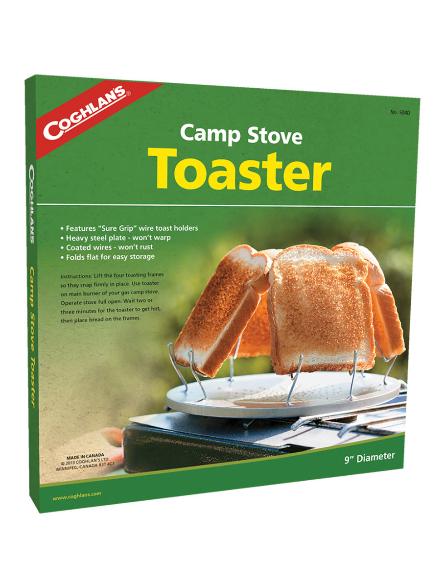 Coghlan’s Camp Stove Toaster is an easy and convenient way to make toast on your camping stove. The toaster holds up to 4 slices of toast at the same time to make the perfect camp breakfast. Made of a lightweight steel plate base with durable, rust-resistant wires that fold flat for easy storage. The base plate has a diameter of 9", and is designed to fit on the main burner of most gas stoves. Ideal for camping, RVing, at the cabin, or even in the backyard.