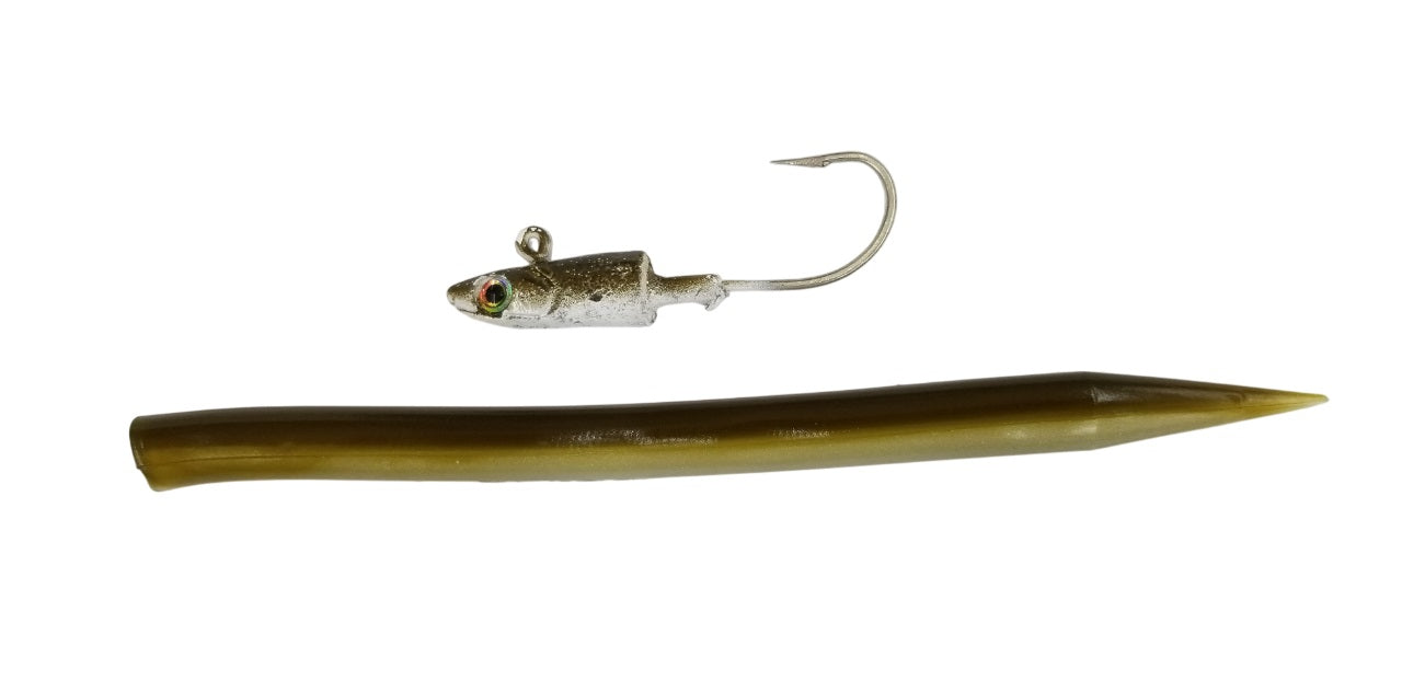 The Bill Hurley Lures 7.5" 3/4 oz. Cape Cod Sand Eel features pure sand eel oil and a Owner 3XXX 5/0 hook. This package includes one jig head and five mouse tails.