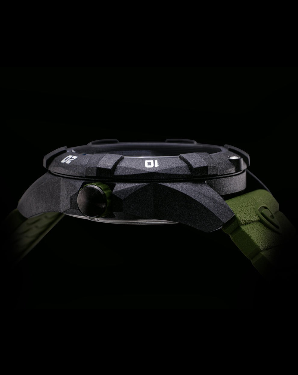 - 42mm Carbon Composite Case and Bezel, with Screw-on Stainless Steel Case Back.