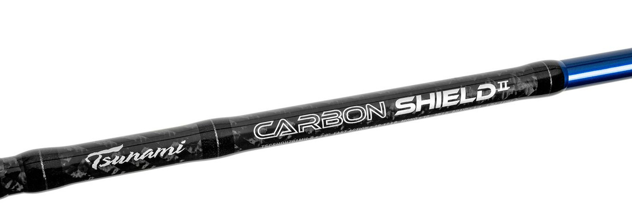 Tsunami Carbon Shield II Spinning Rods are designed with Fuji K Guides with Fazlite inserts. Made with feather light IM7 graphite blanks with D16 nanotech and unique carbon fiber design. D16 Nanotech blank technology consists of multi-directional layers of IM7 carbon fiber that have been injected with Nano resin and wrapped in 8 different angles which evenly disperse flexural force in 16 directions. This combination provides an extremely lightweight blank that resists twist and adds hoop strength. These rods make casting to, hooking, and fighting big fish as easy as it gets. Great choice whether you are casting soft plastics to striped bass in the northeast or using live bait for redfish and other inshore saltwater species in the south.