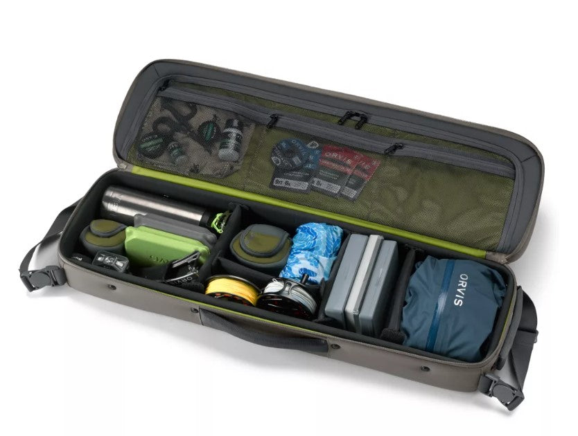 The Orvis Carry-It-All bag was designed years ago by Orvis Chairman Perk Perkins to be sure his equipment stayed safe and in his possession on flights to fly-fishing destinations. It's been a customer-proven success for almost two decades and now it's even better. Built from 100% recycled CORDURA® ECO®, the Carry It All protects and organizes all your fly-fishing equipment in a separate internal zippered storage compartment for rods and internal compartments with improved adjustable dividers to securely customize the storage of all of your gear. Zippered stretch-mesh compartments offer additional divided storage. The main compartment is protected by a lockable zipper. The outer corners are reinforced for extra protection and there is an external zippered pocket for quick access items. Removable padded shoulder strap. Float plane, jet plane, or the back of the truck, this is the best protection your equipment can have.