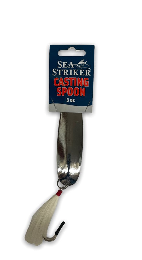 Nickel plated and polished casting spoons. Hook are plated for saltwater use. Individually packaged with header or 12 bulk bag.