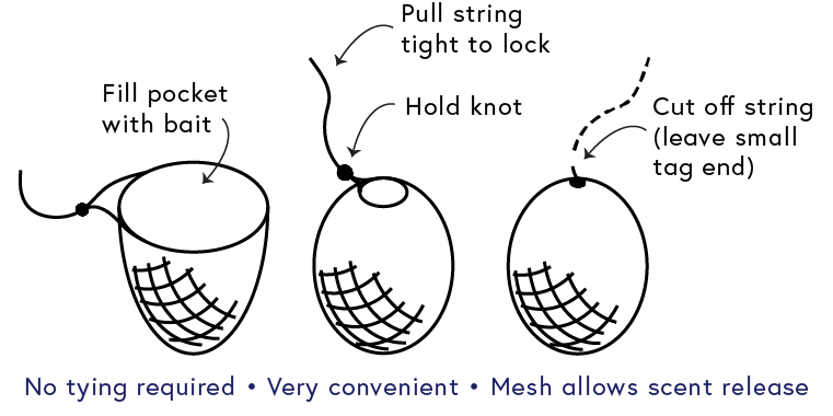 - Just fill bait pocket with bait, hold the knot and pull the long sting tight - cut off tag ends