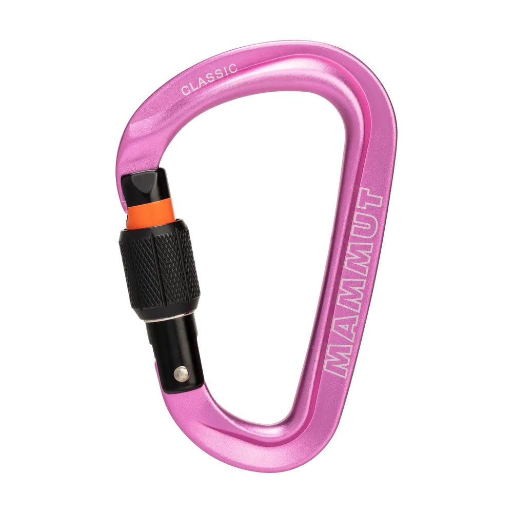 The Classic HMS Screwgate is a medium-size versatile pear-shaped carabiner. It is suitable for constructing belay stations and for belaying using an HMS knot or belay device; it allows the rope to run smoothly and reduces wear. The screw locking is easy to operate even in icy or dirty environments. The key lock nose ensures easy clipping and unclipping without snagging. The orange marking is an additional safety feature, acting as a warning if the carabiner is not screwed closed.