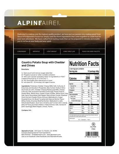 Creamy potato soup accented with shreds of cheddar cheese and chives with a hint of black pepper. Just add water and your delicious meal is ready in 10-12 minutes. Dedicated to making only the highest quality product, we have put our passion into making great food. Since 1979 AlpineAire Foods has simply used the finest ingredients that come together to create fuel for your next adventure. We have crafted fresh tasting meals that can be prepared in minutes and enable you to recharge your body and your spirit.