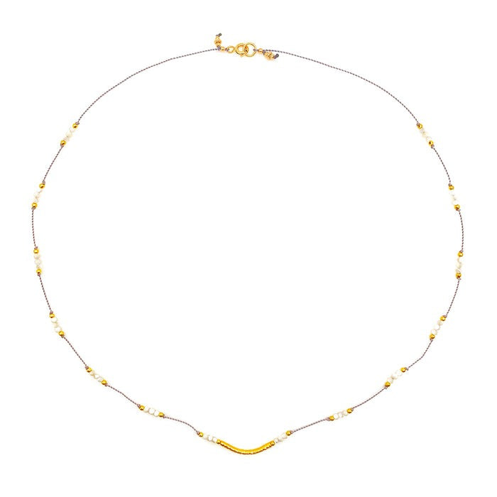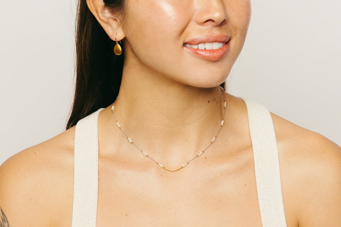 A center arc of detailed 24 karat gold vermeil marks the grounding point of this super delicate but incredibly durable gemstone necklace. Hand knotted on nylon, Mother of Pearl beads form a trail around your neck and end in an adjustable closure so you can wear this beautiful little piece as a short choker (swoon!) or as the longer layer!