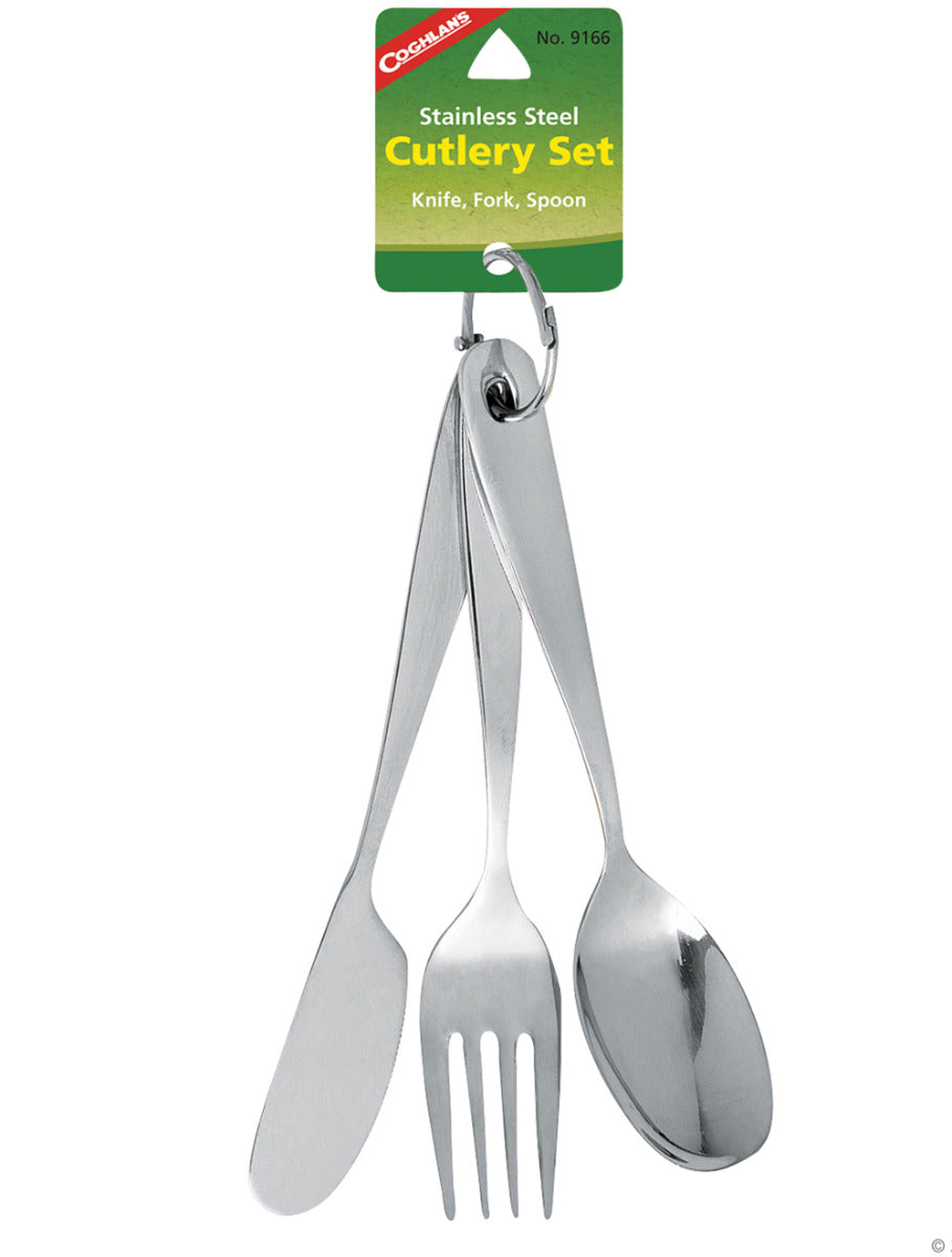 This cutlery set is made with high quality stainless steel. The knife, fork and spoon set include a handy detachable ring to easily attach onto your pack.