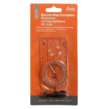 p>Enjoy the journey while using the SOL Deluxe Map Compass on your next adventure. Use the magnifying glass to zoom in on the tiny details of your map. Adjust your reading for True North with the fixed declination so you stay on course. The liquid-filled capsule with a luminescent ring and needle ensures stable and consistent readings even in dim light. The metric and imperial rulers on the beveled edges of the baseplate help you get an accurate map reading. All this rests on the extended baseplate with a rounded edge that sits comfortably in your palm. Never miss another key waypoint or landmark for a photo op with the SOL Deluxe Map Compass to guide you. To be used in the northern hemisphere only.