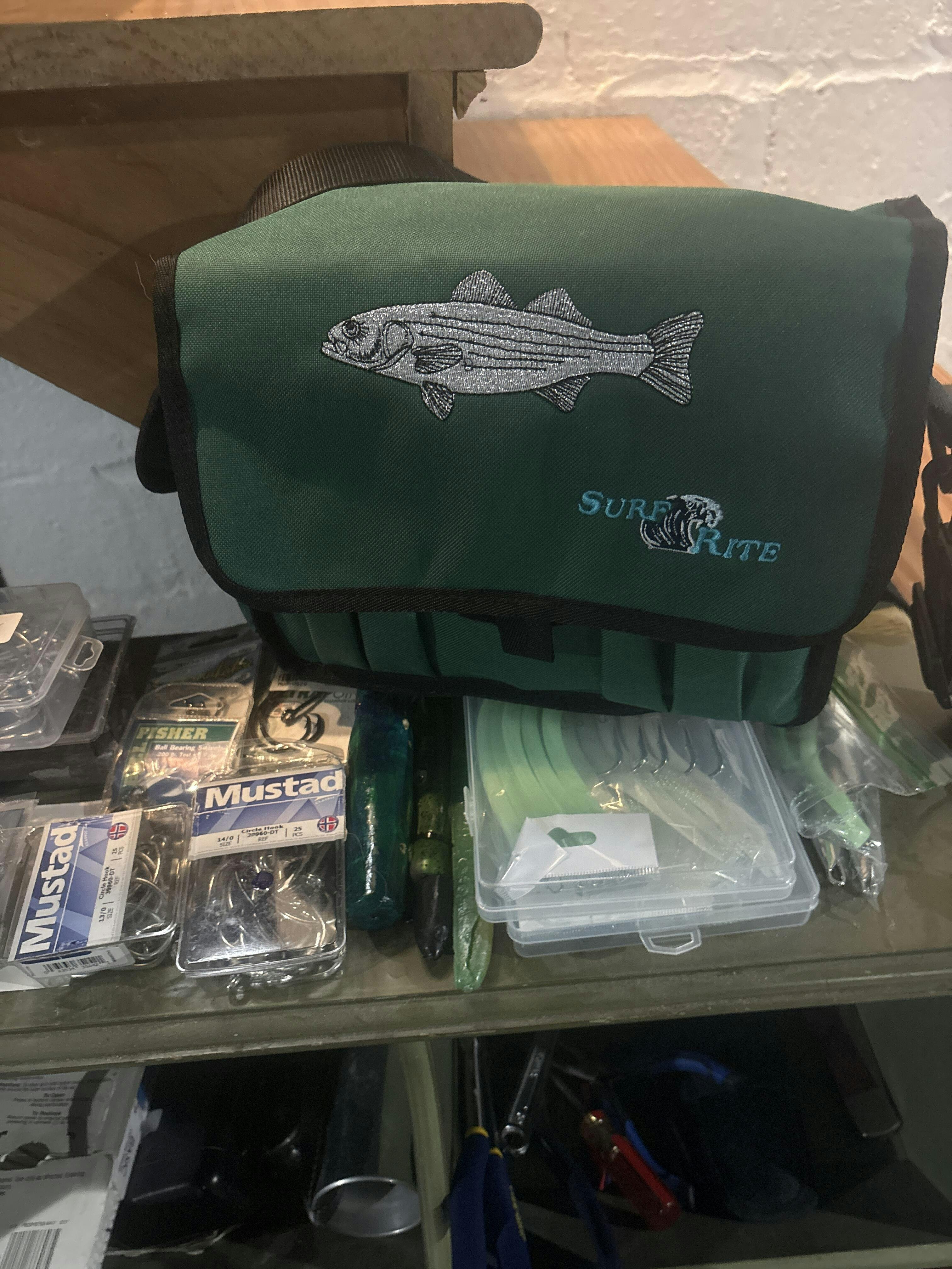 The FJ Neil Deluxe Striper Surf Bag is made from a heavy-duty waterproof material with grommeted drain holes at the bottom. This bag is a must have for any surfcaster. It has five front pockets and one side pocket which is on the exterior. The large main compartment holds ten 2" x 2" tubes, which are included. The front flap's lower section is lined with velcro to cover the plugs up and keep the water out. This bag comes with an adjustable shoulder strap as well as nylon belt loops. The belt loops have one side stitched into the bag and velcro on the other side. This allows the angler to securely loop around their wader belt.