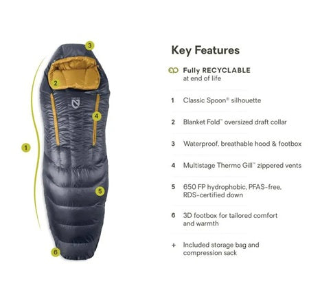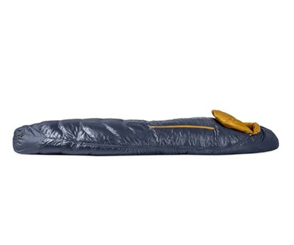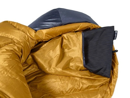 - Hood and footbox are reinforced with recyclable material treated with PFAS-free waterproofing to prevent tent condensation from soaking into the bag’s fabric.