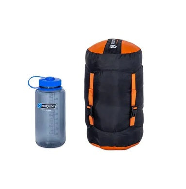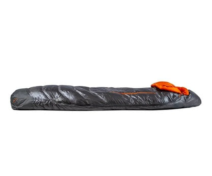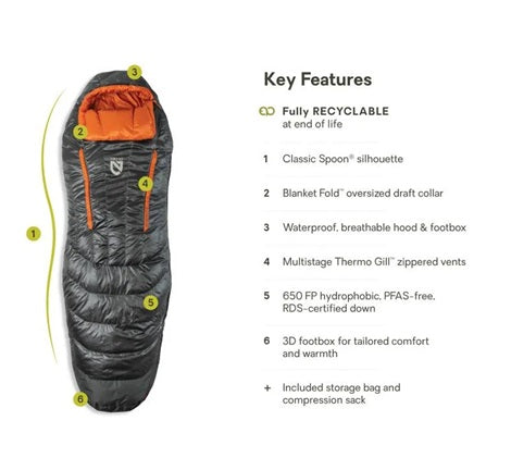 - Hood and footbox are reinforced with recyclable material treated with PFAS-free waterproofing to prevent tent condensation from soaking into the bag’s fabric.