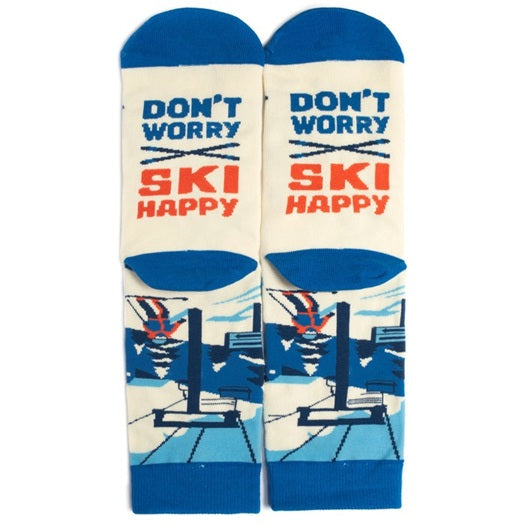 Step into the thrilling world of skiing with our "Don't Worry, Ski Happy" themed socks! These socks are a playful tribute to the joy and excitement of hitting the slopes. Featuring a fun design of skiers in action and a positive message to keep you motivated on the slopes, these socks will bring a smile to your face every time you put them on.