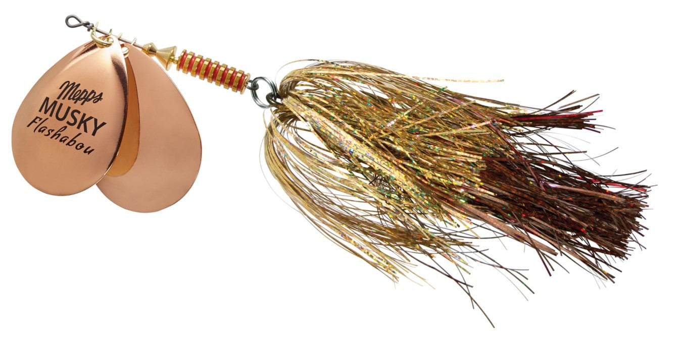 The Mepps 1.5 oz. Double Blade Musky Flashabou Spinner features heavy duty Colorado blades and a rugged, free-spinning clevis in a double blade configuration. The solid brass components mean every Musky Flashabou is perfectly balanced and extremely durable. A heavy duty split ring allows for easy flashabou tail changes while also eliminating the leverage a big fish can exert on other straight wire musky lures. All tails are hand tied with 100% holographic flashabou for outstanding durability, flash, and lifelike movement. The Mepps time-tested, tandem hook assembly incorporates heavy duty, extra sharp treble hooks. Retrieve it at a slow to medium speed, bulged just under the surface or burned over the top of weeds.