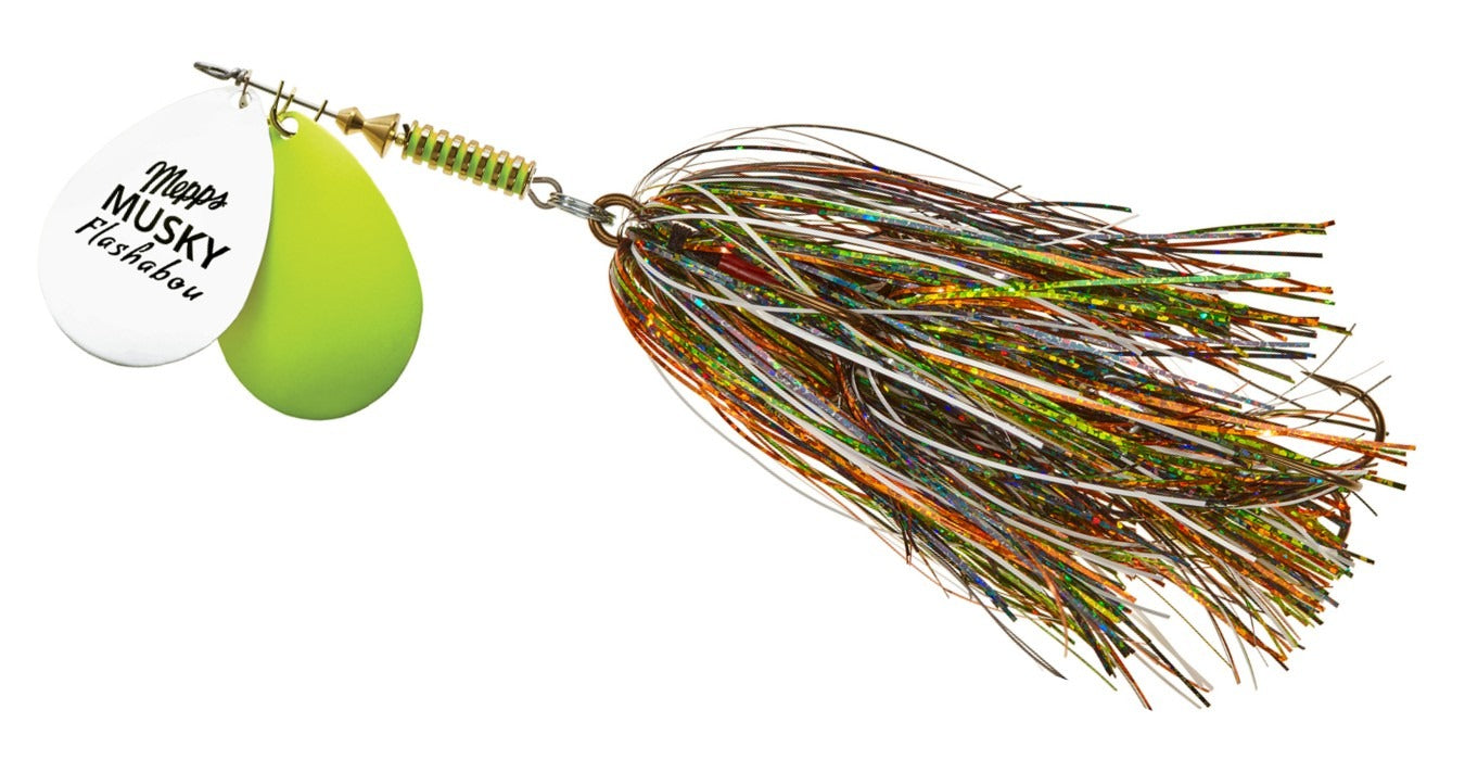 The Mepps 1.5 oz. Double Blade Musky Flashabou Spinner features heavy duty Colorado blades and a rugged, free-spinning clevis in a double blade configuration. The solid brass components mean every Musky Flashabou is perfectly balanced and extremely durable. A heavy duty split ring allows for easy flashabou tail changes while also eliminating the leverage a big fish can exert on other straight wire musky lures. All tails are hand tied with 100% holographic flashabou for outstanding durability, flash, and lifelike movement. The Mepps time-tested, tandem hook assembly incorporates heavy duty, extra sharp treble hooks. Retrieve it at a slow to medium speed, bulged just under the surface or burned over the top of weeds.