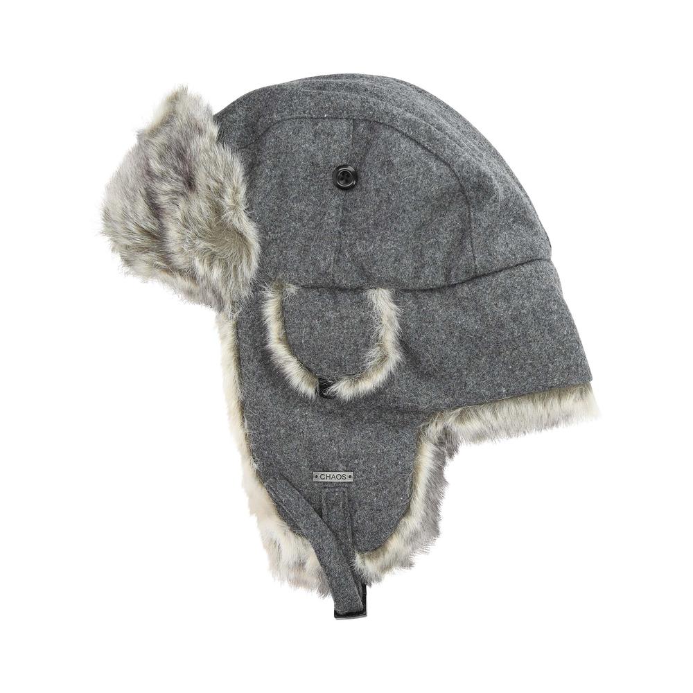 Wool blend trapper with faux fur trim.