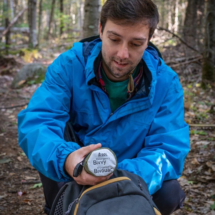 The Emergency Bivvy OD Green with Rescue Whistle will keep you warm and dry in an emergency. Weighing less than 4 oz. and smaller than a soda can, bivvy reflects 90% of your body heat back to you and is sealed to protect you from wind, rain, and snow. Bivvy features an attached tinder cord drawstring for fire starting and a survival whistle.