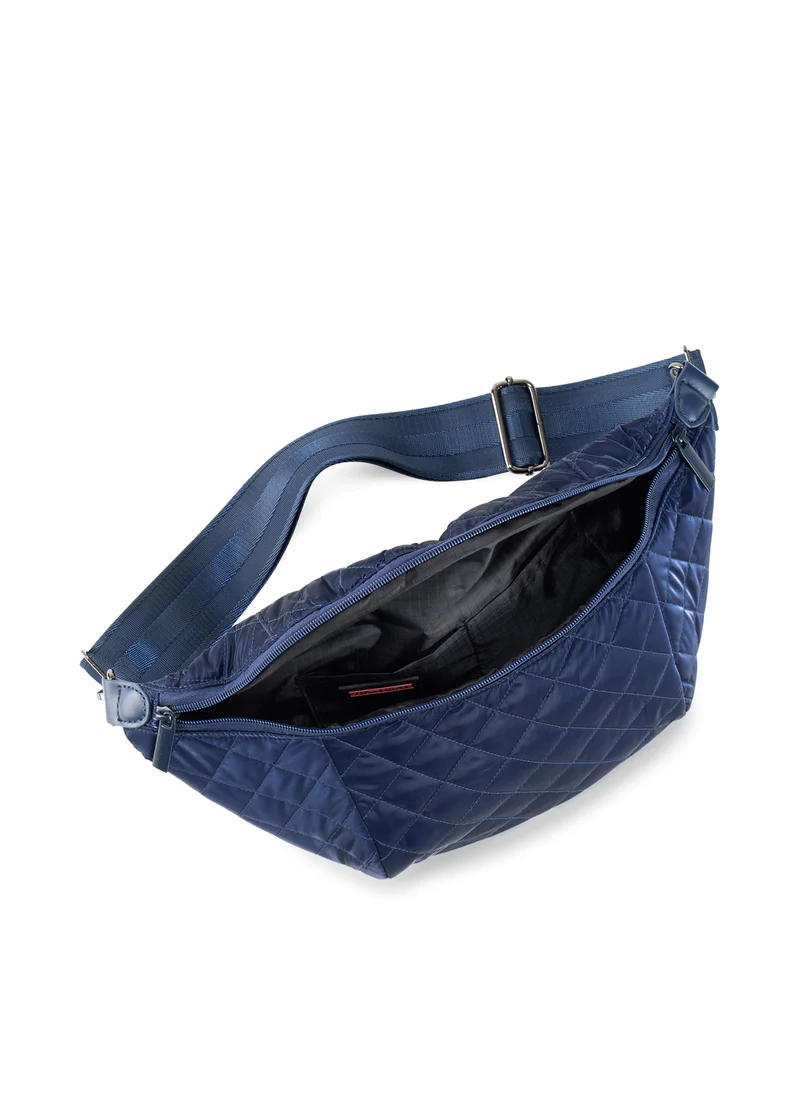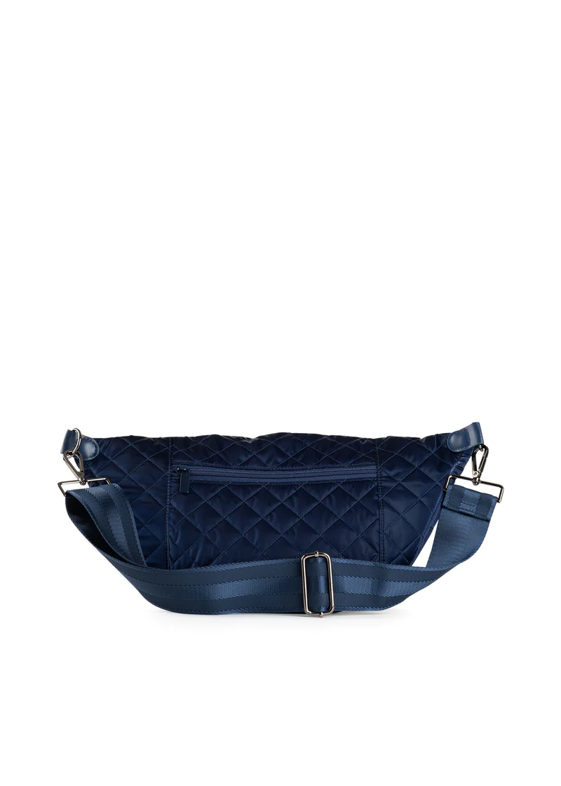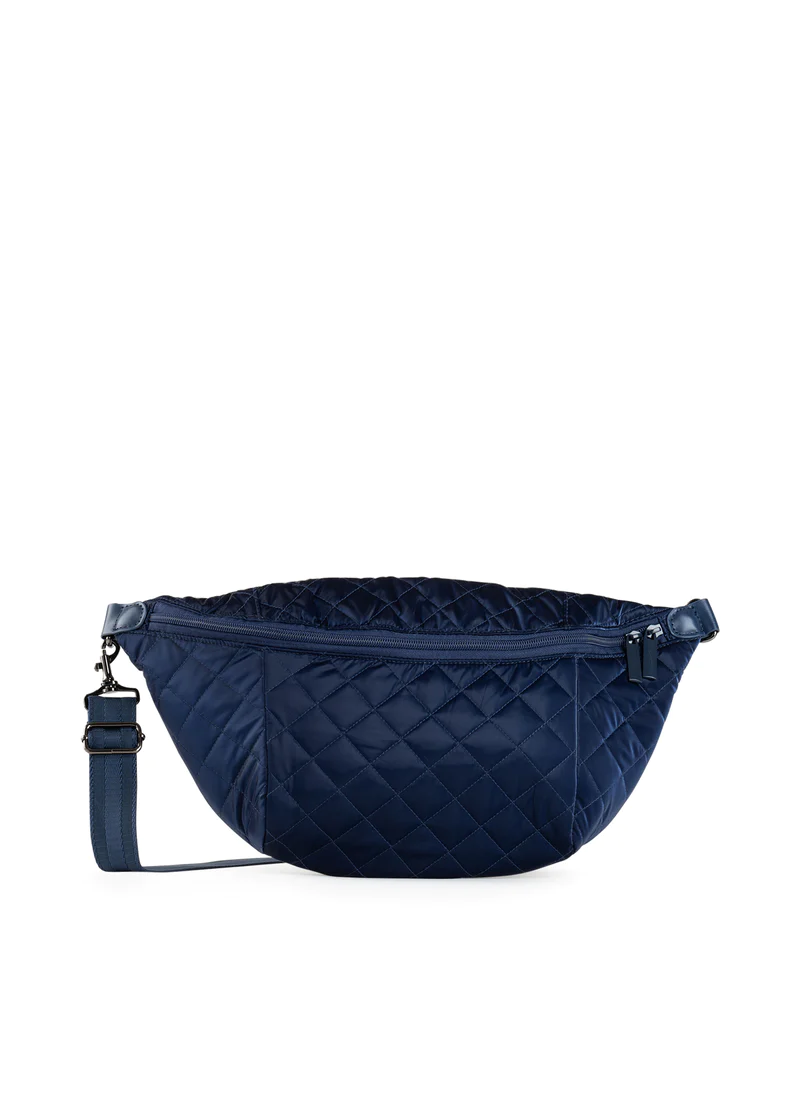 - Quilted puffer sling bag featuring top entry and additional back zip pocket. Sling strap adjustable to 40 inches.