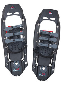 UniBody Traction: Steel traction rails and brake bars molded directly into snowshoe decks provide a secure grip. Essential Security: TriFit bindings deliver ample, freeze-resistant and glove-friendly security, easily accommodating a wide range of footwear. Uphill Efficiency: Televator heel lifts reduce fatigue and increase traction on the steeps, and are easily engaged with a glove-friendly pull tab. All-Condition Adaptability: Modular Flotation tails allow you the maneuverability of a smaller shoe in packed conditions with the added, on-demand flotation of optional, 6-inch (15-cm) tails for powder or carrying heavier loads.