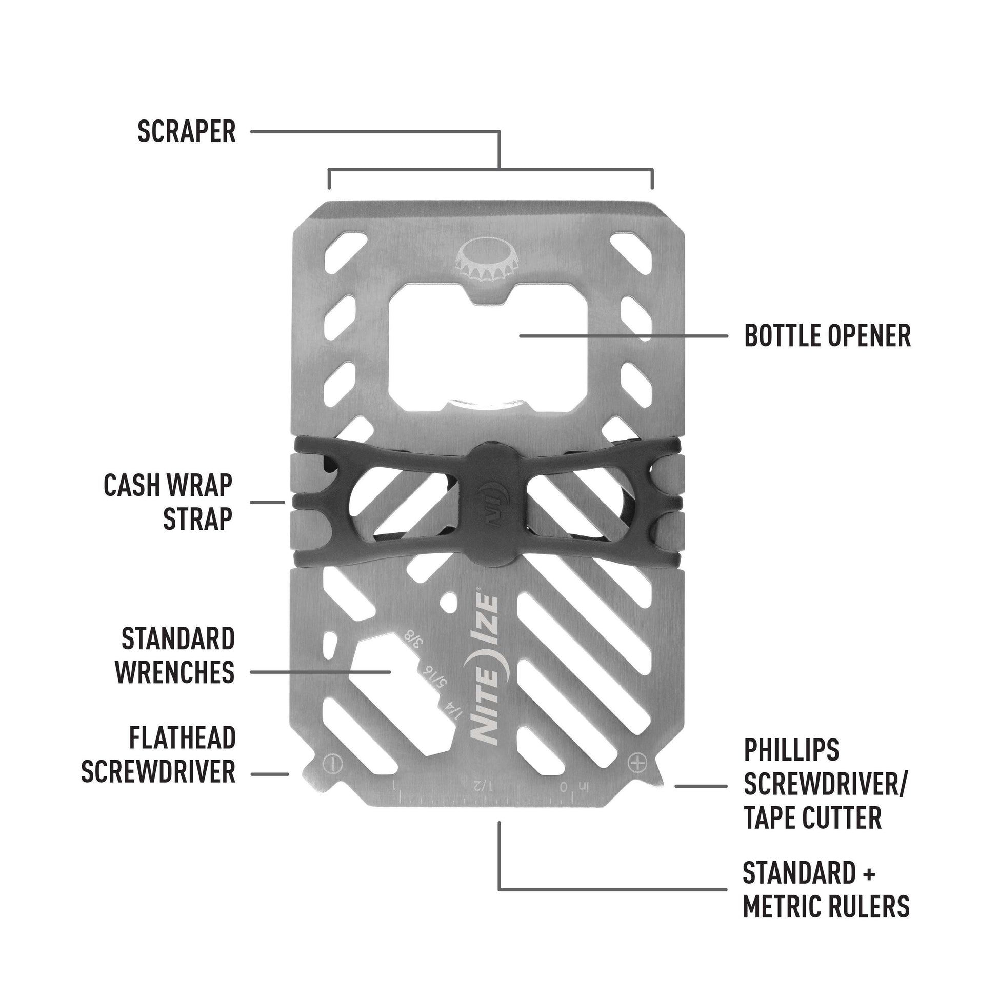 - includes: Cash Wrap strap, scraper, bottle opener, 3 wrenches (1/4", 5/16", and 3/8"), flathead screwdriver, Phillips screwdriver/tape cutter, metric + imperial ruler