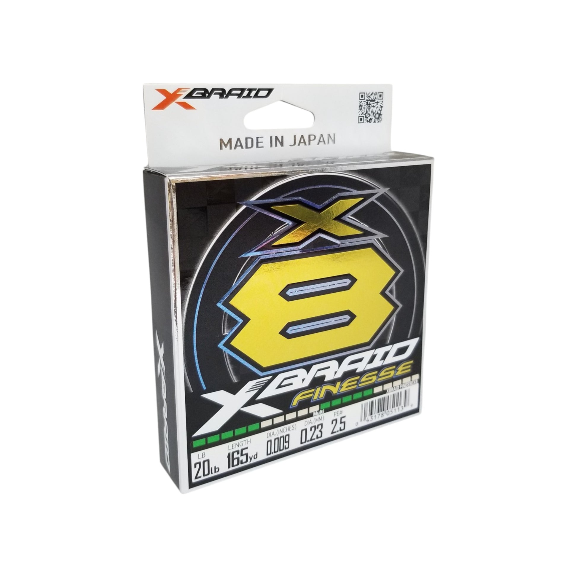 The XBraid 20 lb. test Finesse X8 Braided Line is 165 yards of braided line and features proprietary WX weaving technology to boast nearly double the weaves per inch compared to its competitors. The denser weave pattern increases abrasion resistance, increases stiffness for easier line management, and increases energy transfer to the rod. The camo color shift pattern further enhances its deception beneath the water's surface and the ultra-smooth coating maximizes smoothness, resulting in longer and more accurate casts.
