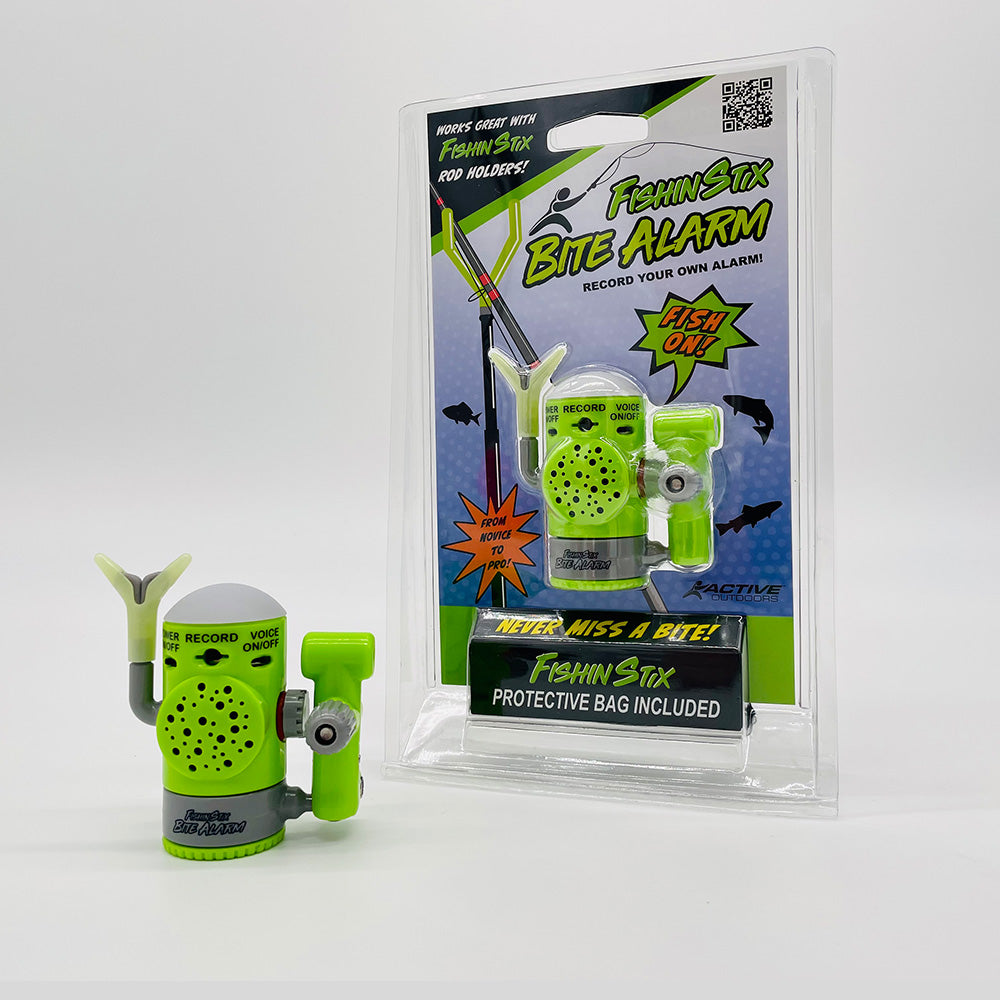 Simply clamp the FishinStix Bite Alarm onto your rod or rod holder and set your line in the rubber gripper ensuring slack between the alarm and reel. The alarm is triggered by the fish pulling the line and moving the arm forward. Drag and Sens knobs can be adjusted to micro tune and detect the softest bite! To record a new alarm, simply press and hold the button recording a message of up to six seconds.