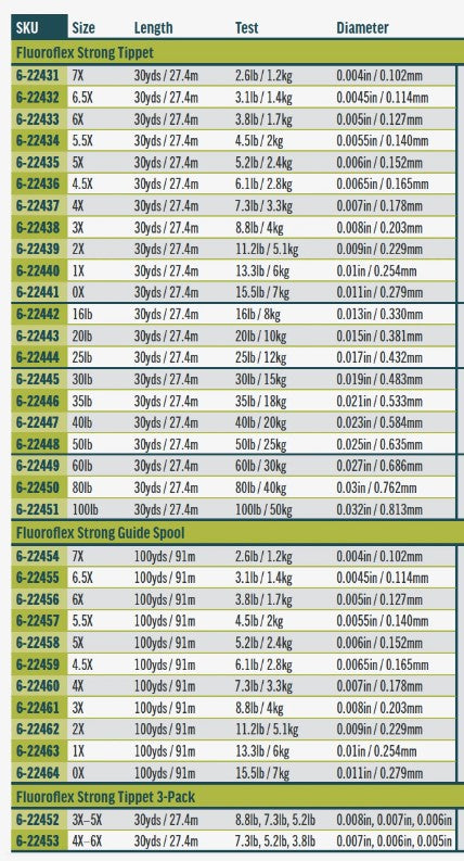 RIO's newest tippet material is an ultra-strong, 100% fluorocarbon with exceptionally high tensile strength. The material is very easy to tie knots in, with high knot strength and a smooth finish that ensures knots seat easily and tightly. The high break strength to diameter ratio makes this a fantastic fluorocarbon for the trout fly fisher. RIO is proud to introduce "half sizes" of core trout diameters, giving anglers an extra choice when faced with the decision to choose between, say 4X and 5X. Our new 6.5X, 5.5X and 4.5X sizes will make those decisions easier. Each spool has 30 yards of top quality material spooled on, though for those who use a lot of fluoro, our Guide spools each have 100 yards spooled on.