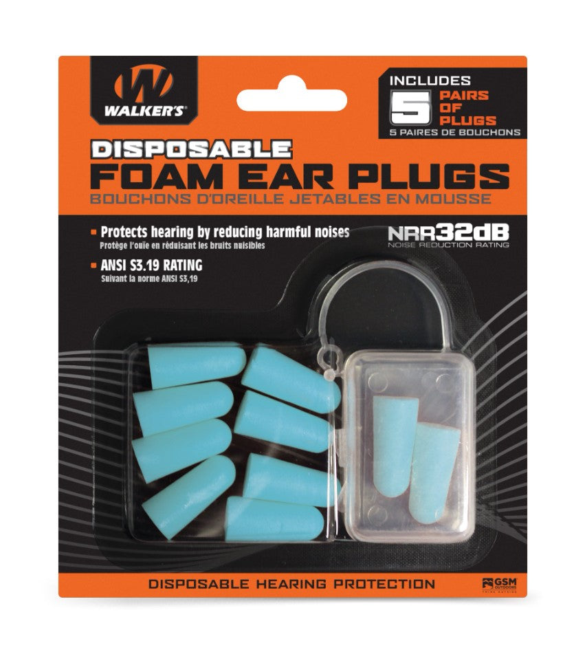 5 pack of disposable foam ear plugs. Noise Reduction Rating NRR 32DB