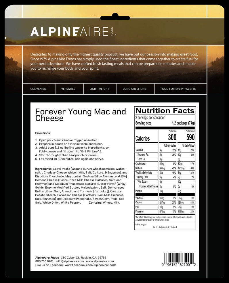 Give your body the fuel it needs and your taste buds the flavor they love on your adventures with the AlpineAire Foods Forever Young Mac and Cheese Entrée. Featuring a creamy 3-cheese sauce with vegetable add-ins like peas, carrots, and corn, this dehydrated meal delivers the nutrition and taste you need. Just-add-water convenience means your meal is ready in about 10–12 minutes.